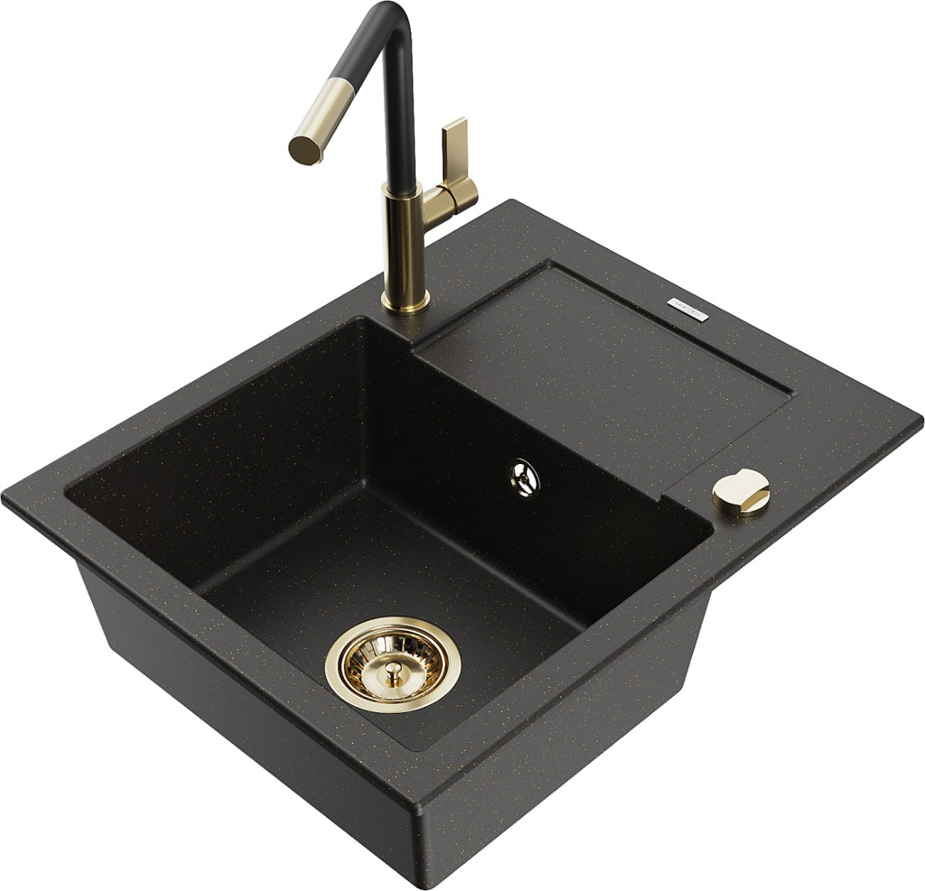 Technické dáta: drez: Rozmer: 576x465x174mm Hĺbka komory: 164 mm Rozmery komory: 395x320 mm Priemer odtoku: ø90 mm Typ: 1-miska s krátkym odkvapkávačom Typ: Zapustené do pracovnej dosky Farba: čierna / zlatá metalíza Povrchová úprava sifónu: zlatá Materiál: žula (80% žulové kamenivo, 20% živice) Prepadový otvor: Áno Otvory: (batérie, automatické) 2 Inštalácia: Univerzálna, je možné inštalovať s odkvapkávačom na ľavú alebo pravú stranu Vysoká odolnosť proti poškriabaniu a zmene farby Odolnosť proti tepelným šokom Ľahko čistiteľný povrch Dva dodatočné vyfrézované otvory na samodierovanie ø35 kuchynská batéria: Materiál: mosadz Farba: Zlatá/Čierna Hlava: Keramická Prevzdušňovač: Áno Typ: Jedna páka Rozsah výtoku: 245 mm Výška batérie: 307 mm(GT) Ean: 5905315058768