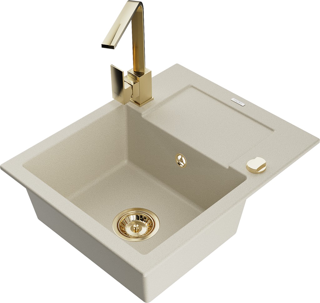 Technické dáta: drez: Rozmer: 576x465x174mm Hĺbka komory: 164 mm Rozmery komory: 395x320 mm Priemer odtoku: ø90 mm Typ: 1-miska s krátkym odkvapkávačom Typ: Zapustené do pracovnej dosky Farba béžová Povrchová úprava sifónu: zlatá Materiál: žula (80% žulové kamenivo, 20% živice) Prepadový otvor: Áno Otvory: (batérie, automatické) 2 Inštalácia: Univerzálna, je možné inštalovať s odkvapkávačom na ľavú alebo pravú stranu Vysoká odolnosť proti poškriabaniu a zmene farby Odolnosť proti tepelným šokom Ľahko čistiteľný povrch Dva dodatočné vyfrézované otvory na samodierovanie ø35 kuchynská batéria: Materiál: mosadz Farba: Zlatá Hlava: Keramická Prevzdušňovač: Áno Typ: Jedna páka Výška batérie: 300 mm (GT) Ean: 5905315018557