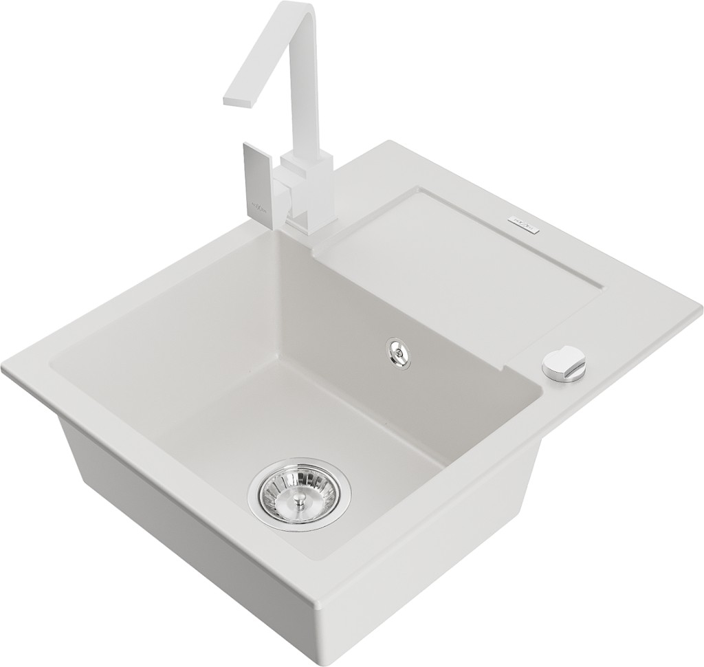 Technické dáta: drez: Rozmer: 576x465x174mm Hĺbka komory: 164 mm Rozmery komory: 395x320 mm Priemer odtoku: ø90 mm Typ: 1-miska s krátkym odkvapkávačom Typ: Zapustené do pracovnej dosky biela farba Povrchová úprava sifónu: Chrome Materiál: žula (80% žulové kamenivo, 20% živice) Prepadový otvor: Áno Otvory: (batérie, automatické) 2 Inštalácia: Univerzálna, je možné inštalovať s odkvapkávačom na ľavú alebo pravú stranu Vysoká odolnosť proti poškriabaniu a zmene farby Odolnosť proti tepelným šokom Ľahko čistiteľný povrch Dva dodatočné vyfrézované otvory na samodierovanie ø35 kuchynská batéria: Materiál: mosadz biela farba Hlava: Keramická Prevzdušňovač: Áno Typ: Jedna páka Výška batérie: 290 mm Rozsah výtoku: 220 mm(GT) Ean: 5905315018502
