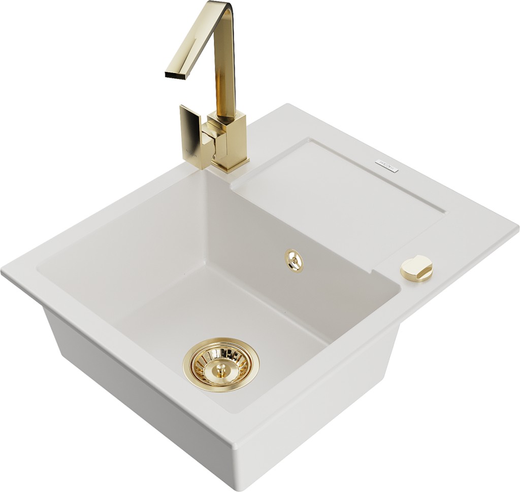 Technické dáta: drez: Rozmer: 576x465x174mm Hĺbka komory: 164 mm Rozmery komory: 395x320 mm Priemer odtoku: ø90 mm Typ: 1-miska s krátkym odkvapkávačom Typ: Zapustené do pracovnej dosky biela farba Povrchová úprava sifónu: zlatá Materiál: žula (80% žulové kamenivo, 20% živice) Prepadový otvor: Áno Otvory: (batérie, automatické) 2 Inštalácia: Univerzálna, je možné inštalovať s odkvapkávačom na ľavú alebo pravú stranu Vysoká odolnosť proti poškriabaniu a zmene farby Odolnosť proti tepelným šokom Ľahko čistiteľný povrch Dva dodatočné vyfrézované otvory na samodierovanie ø35 kuchynská batéria: Materiál: mosadz Farba: Zlatá Hlava: Keramická Prevzdušňovač: Áno Typ: Jedna páka Výška batérie: 290 mm Rozsah výtoku: 220 mm(GT) Ean: 5905315018519