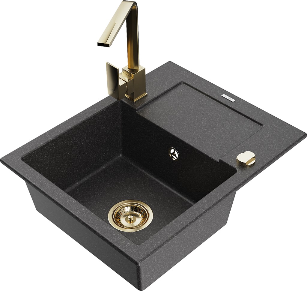 Technické dáta: drez: Rozmer: 576x465x174mm Hĺbka komory: 164 mm Rozmery komory: 395x320 mm Priemer odtoku: ø90 mm Typ: 1-miska s krátkym odkvapkávačom Typ: Zapustené do pracovnej dosky Farba: Škvrnitá čierna Povrchová úprava sifónu: zlatá Materiál: žula (80% žulové kamenivo, 20% živice) Prepadový otvor: Áno Otvory: (batérie, automatické) 2 Inštalácia: Univerzálna, je možné inštalovať s odkvapkávačom na ľavú alebo pravú stranu Vysoká odolnosť proti poškriabaniu a zmene farby Odolnosť proti tepelným šokom Ľahko čistiteľný povrch Dva dodatočné vyfrézované otvory na samodierovanie ø35 kuchynská batéria: Materiál: mosadz Farba: Zlatá Hlava: Keramická Prevzdušňovač: Áno Typ: Jedna páka Výška batérie: 290 mm Rozsah výtoku: 220 mm(GT) Ean: 5905315018724