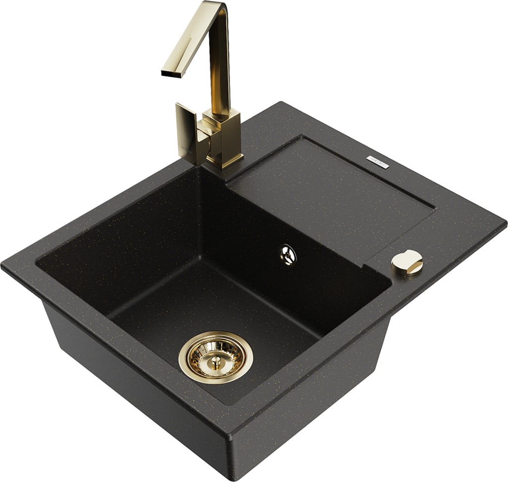 Technické dáta: drez: Rozmer: 576x465x174mm Hĺbka komory: 164 mm Rozmery komory: 395x320 mm Priemer odtoku: ø90 mm Typ: 1-miska s krátkym odkvapkávačom Typ: Zapustené do pracovnej dosky Farba: čierna / zlatá metalíza Povrchová úprava sifónu: zlatá Materiál: žula (80% žulové kamenivo, 20% živice) Prepadový otvor: Áno Otvory: (batérie, automatické) 2 Inštalácia: Univerzálna, je možné inštalovať s odkvapkávačom na ľavú alebo pravú stranu Vysoká odolnosť proti poškriabaniu a zmene farby Odolnosť proti tepelným šokom Ľahko čistiteľný povrch Dva dodatočné vyfrézované otvory na samodierovanie ø35 kuchynská batéria: Materiál: mosadz Farba: Zlatá Hlava: Keramická Prevzdušňovač: Áno Typ: Jedna páka Výška batérie: 290 mm Rozsah výtoku: 220 mm(GT) Ean: 5905315018670