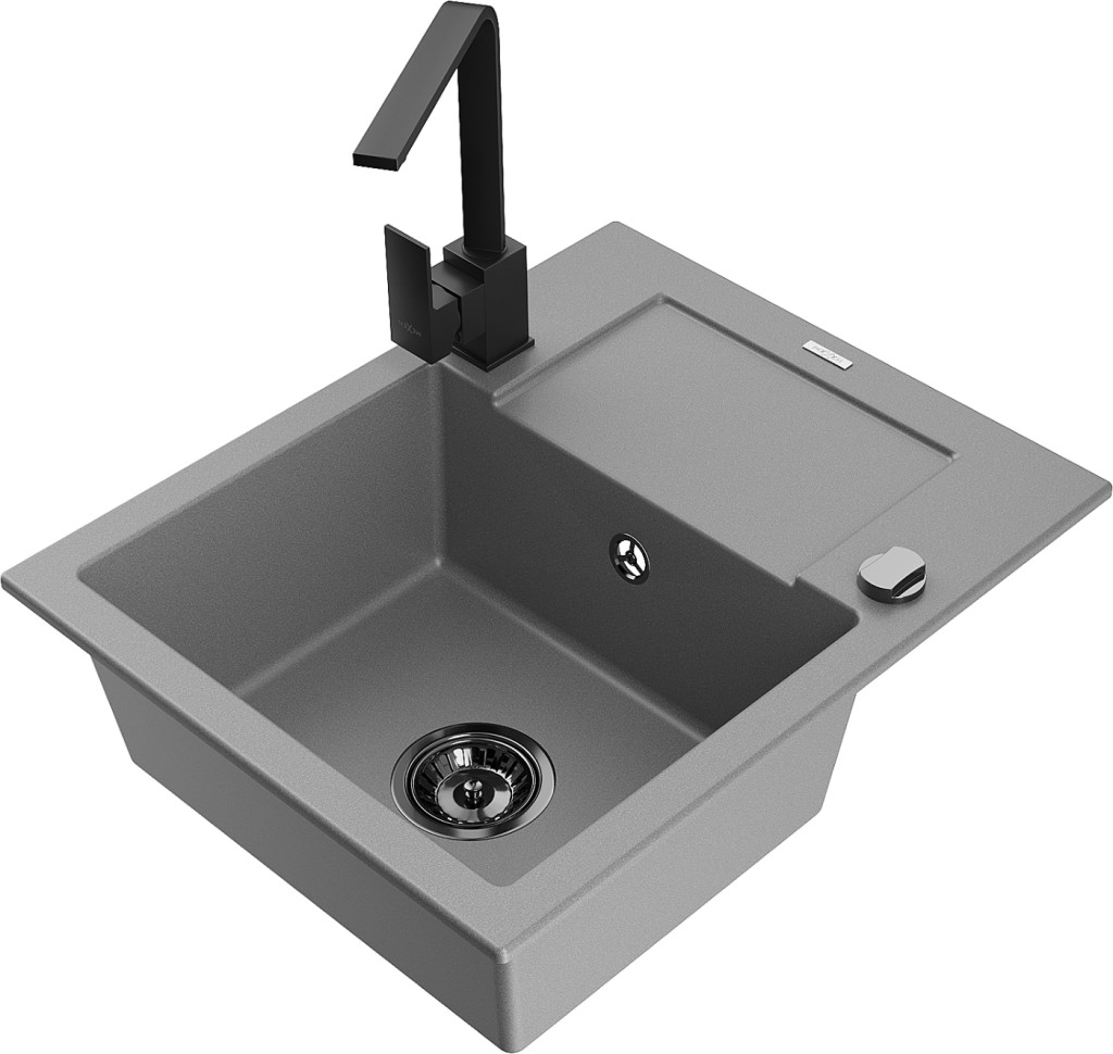 Technické dáta: drez: Rozmer: 576x465x174mm Hĺbka komory: 164 mm Rozmery komory: 395x320 mm Priemer odtoku: ø90 mm Typ: 1-miska s krátkym odkvapkávačom Typ: Zapustené do pracovnej dosky Šedá farba Povrchová úprava sifónu: čierna Materiál: žula (80% žulové kamenivo, 20% živice) Prepadový otvor: Áno Otvory: (batérie, automatické) 2 Inštalácia: Univerzálna, je možné inštalovať s odkvapkávačom na ľavú alebo pravú stranu Vysoká odolnosť proti poškriabaniu a zmene farby Odolnosť proti tepelným šokom Ľahko čistiteľný povrch Dva dodatočné vyfrézované otvory na samodierovanie ø35 kuchynská batéria: Materiál: mosadz Čierna farba Hlava: Keramická Prevzdušňovač: Áno Typ: Jedna páka Výška batérie: 290 mm Rozsah výtoku: 220 mm(GT) Ean: 5905315018601