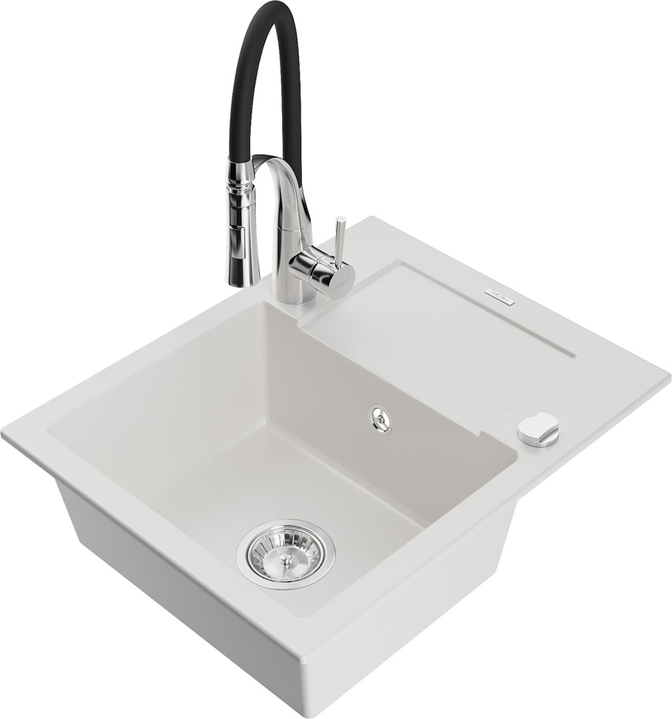 Technické dáta: drez: Rozmer: 576x465x174mm Hĺbka komory: 164 mm Rozmery komory: 395x320 mm Priemer odtoku: ø90 mm Typ: 1-miska s krátkym odkvapkávačom Typ: Zapustené do pracovnej dosky biela farba Povrchová úprava sifónu: Chrome Materiál: žula (80% žulové kamenivo, 20% živice) Prepadový otvor: Áno Otvory: (batérie, automatické) 2 Inštalácia: Univerzálna, je možné inštalovať s odkvapkávačom na ľavú alebo pravú stranu Vysoká odolnosť proti poškriabaniu a zmene farby Odolnosť proti tepelným šokom Ľahko čistiteľný povrch Dva dodatočné vyfrézované otvory na samodierovanie ø35 kuchynská batéria: Materiál: mosadz Farba: chróm/čierna Hlava: Keramická Prevzdušňovač: Áno Typ: Jedna páka Výška batérie: 430 mm Rozsah výtoku: 185 mm Batéria má výsuvný výtok(GT) Ean: 5905315044624