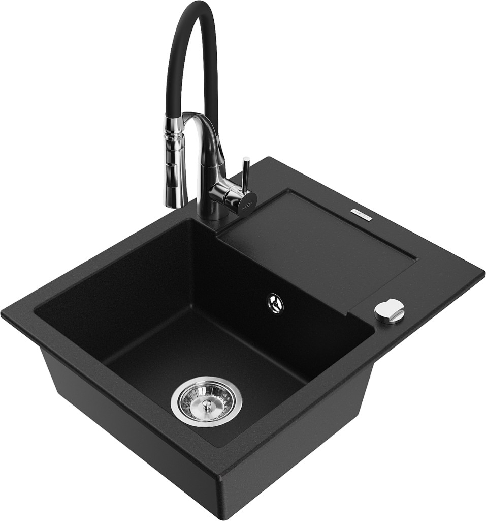 Technické dáta: drez: Rozmer: 576x465x174mm Hĺbka komory: 164 mm Rozmery komory: 395x320 mm Priemer odtoku: ø90 mm Typ: 1-miska s krátkym odkvapkávačom Typ: Zapustené do pracovnej dosky Čierna farba Povrchová úprava sifónu: Chrome Materiál: žula (80% žulové kamenivo, 20% živice) Prepadový otvor: Áno Otvory: (batérie, automatické) 2 Inštalácia: Univerzálna, je možné inštalovať s odkvapkávačom na ľavú alebo pravú stranu Vysoká odolnosť proti poškriabaniu a zmene farby Odolnosť proti tepelným šokom Ľahko čistiteľný povrch Dva dodatočné vyfrézované otvory na samodierovanie ø35 kuchynská batéria: Materiál: mosadz Farba: chróm/čierna Hlava: Keramická Prevzdušňovač: Áno Typ: Jedna páka Výška batérie: 430 mm Rozsah výtoku: 185 mm Batéria má výsuvný výtok(GT) Ean: 5905315044983
