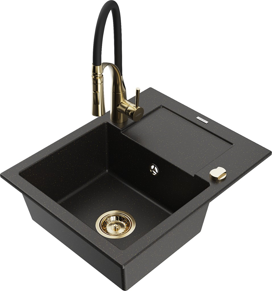 Technické dáta: drez: Rozmer: 576x465x174mm Hĺbka komory: 164 mm Rozmery komory: 395x320 mm Priemer odtoku: ø90 mm Typ: 1-miska s krátkym odkvapkávačom Typ: Zapustené do pracovnej dosky Farba: čierna / zlatá metalíza Povrchová úprava sifónu: zlatá Materiál: žula (80% žulové kamenivo, 20% živice) Prepadový otvor: Áno Otvory: (batérie, automatické) 2 Inštalácia: Univerzálna, je možné inštalovať s odkvapkávačom na ľavú alebo pravú stranu Vysoká odolnosť proti poškriabaniu a zmene farby Odolnosť proti tepelným šokom Ľahko čistiteľný povrch Dva dodatočné vyfrézované otvory na samodierovanie ø35 kuchynská batéria: Materiál: mosadz Farba: Zlatá/Čierna Hlava: Keramická Prevzdušňovač: Áno Typ: Jedna páka Výška batérie: 430 mm Rozsah výtoku: 185 mm Batéria má výsuvný výtok(GT) Ean: 5905315044884