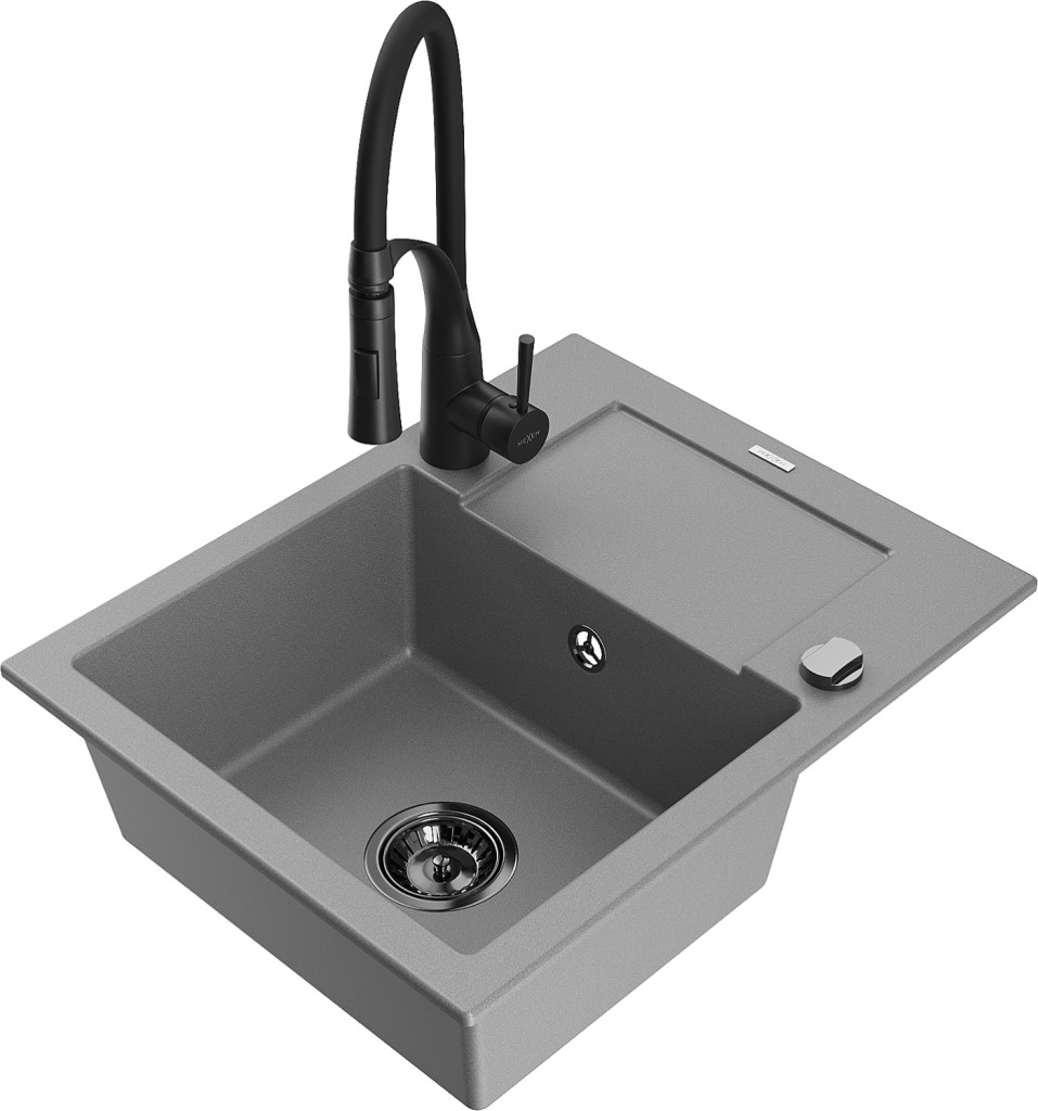 Technické dáta: drez: Rozmer: 576x465x174mm Hĺbka komory: 164 mm Rozmery komory: 395x320 mm Priemer odtoku: ø90 mm Typ: 1-miska s krátkym odkvapkávačom Typ: Zapustené do pracovnej dosky Šedá farba Povrchová úprava sifónu: čierna Materiál: žula (80% žulové kamenivo, 20% živice) Prepadový otvor: Áno Otvory: (batérie, automatické) 2 Inštalácia: Univerzálna, je možné inštalovať s odkvapkávačom na ľavú alebo pravú stranu Vysoká odolnosť proti poškriabaniu a zmene farby Odolnosť proti tepelným šokom Ľahko čistiteľný povrch Dva dodatočné vyfrézované otvory na samodierovanie ø35 kuchynská batéria: Materiál: mosadz Čierna farba Hlava: Keramická Prevzdušňovač: Áno Typ: Jedna páka Výška batérie: 430 mm Rozsah výtoku: 185 mm Batéria má výsuvný výtok(GT) Ean: 5905315044785