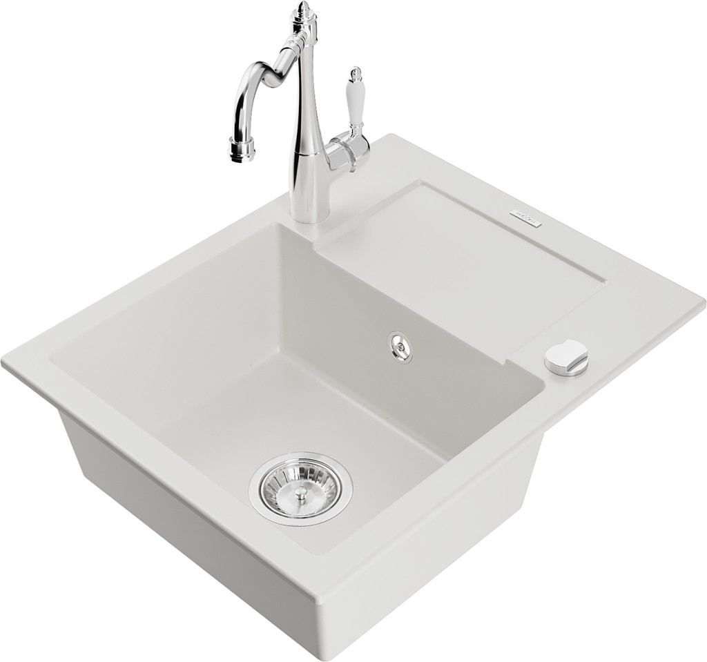 Technické dáta: drez: Rozmer: 576x465x174mm Hĺbka komory: 164 mm Rozmery komory: 395x320 mm Priemer odtoku: ø90 mm Typ: 1-miska s krátkym odkvapkávačom Typ: Zapustené do pracovnej dosky biela farba Povrchová úprava sifónu: Chrome Materiál: žula (80% žulové kamenivo, 20% živice) Prepadový otvor: Áno Otvory: (batérie, automatické) 2 Inštalácia: Univerzálna, je možné inštalovať s odkvapkávačom na ľavú alebo pravú stranu Vysoká odolnosť proti poškriabaniu a zmene farby Odolnosť proti tepelným šokom Ľahko čistiteľný povrch Dva dodatočné vyfrézované otvory na samodierovanie ø35 kuchynská batéria: Materiál: mosadz Farba: Chrome Hlava: Keramická Prevzdušňovač: Áno Typ: Jedna páka Výška batérie: 290 mm Rozsah výtoku: 260 mm(GT) Ean: 5905315038982