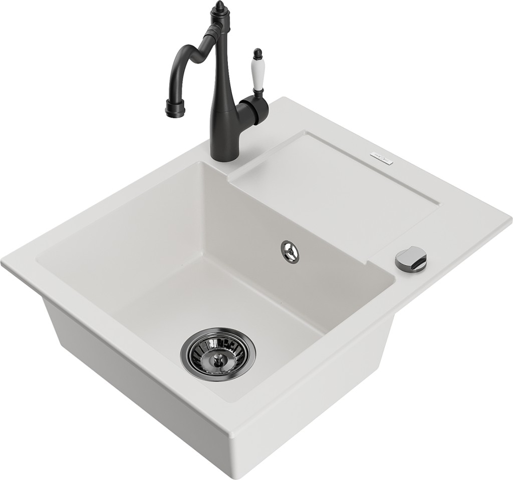 Technické dáta: drez: Rozmer: 576x465x174mm Hĺbka komory: 164 mm Rozmery komory: 395x320 mm Priemer odtoku: ø90 mm Typ: 1-miska s krátkym odkvapkávačom Typ: Zapustené do pracovnej dosky biela farba Povrchová úprava sifónu: čierna Materiál: žula (80% žulové kamenivo, 20% živice) Prepadový otvor: Áno Otvory: (batérie, automatické) 2 Inštalácia: Univerzálna, je možné inštalovať s odkvapkávačom na ľavú alebo pravú stranu Vysoká odolnosť proti poškriabaniu a zmene farby Odolnosť proti tepelným šokom Ľahko čistiteľný povrch Dva dodatočné vyfrézované otvory na samodierovanie ø35 kuchynská batéria: Materiál: mosadz Čierna farba Hlava: Keramická Prevzdušňovač: Áno Typ: Jedna páka Výška batérie: 290 mm Rozsah výtoku: 260 mm(GT) Ean: 5905315039019