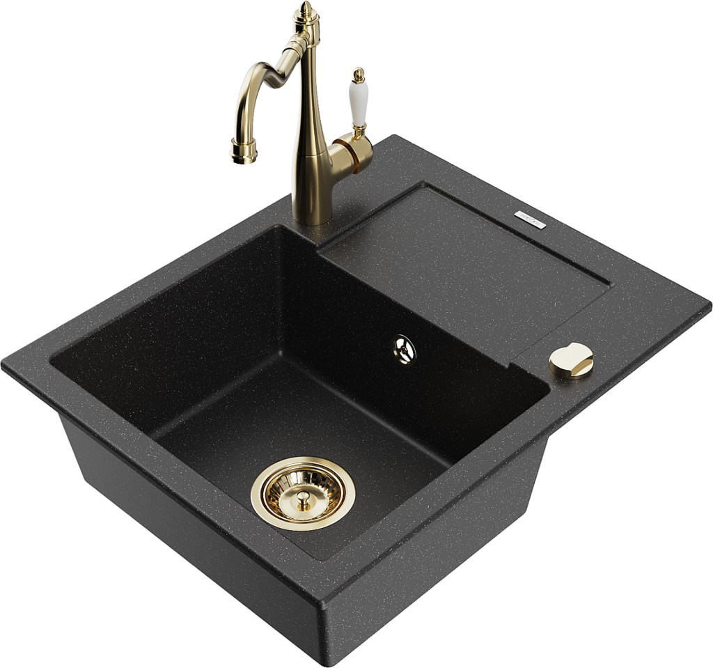 Technické dáta: drez: Rozmer: 576x465x174mm Hĺbka komory: 164 mm Rozmery komory: 395x320 mm Priemer odtoku: ø90 mm Typ: 1-miska s krátkym odkvapkávačom Typ: Zapustené do pracovnej dosky Farba: čierna/strieborná metalíza Povrchová úprava sifónu: zlatá Materiál: žula (80% žulové kamenivo, 20% živice) Prepadový otvor: Áno Otvory: (batérie, automatické) 2 Inštalácia: Univerzálna, je možné inštalovať s odkvapkávačom na ľavú alebo pravú stranu Vysoká odolnosť proti poškriabaniu a zmene farby Odolnosť proti tepelným šokom Ľahko čistiteľný povrch Dva dodatočné vyfrézované otvory na samodierovanie ø35 kuchynská batéria: Materiál: mosadz Farba: Zlatá Hlava: Keramická Prevzdušňovač: Áno Typ: Jedna páka Výška batérie: 290 mm Rozsah výtoku: 260 mm(GT) Ean: 5905315039125