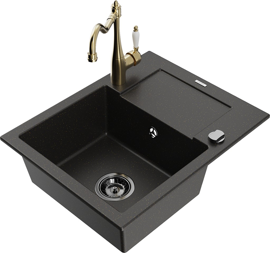 Technické dáta: drez: Rozmer: 576x465x174mm Hĺbka komory: 164 mm Rozmery komory: 395x320 mm Priemer odtoku: ø90 mm Typ: 1-miska s krátkym odkvapkávačom Typ: Zapustené do pracovnej dosky Farba: čierna / zlatá metalíza Povrchová úprava sifónu: čierna Materiál: žula (80% žulové kamenivo, 20% živice) Prepadový otvor: Áno Otvory: (batérie, automatické) 2 Inštalácia: Univerzálna, je možné inštalovať s odkvapkávačom na ľavú alebo pravú stranu Vysoká odolnosť proti poškriabaniu a zmene farby Odolnosť proti tepelným šokom Ľahko čistiteľný povrch Dva dodatočné vyfrézované otvory na samodierovanie ø35 kuchynská batéria: Materiál: mosadz Farba: Zlatá Hlava: Keramická Prevzdušňovač: Áno Typ: Jedna páka Výška batérie: 290 mm Rozsah výtoku: 260 mm(GT) Ean: 5905315039170