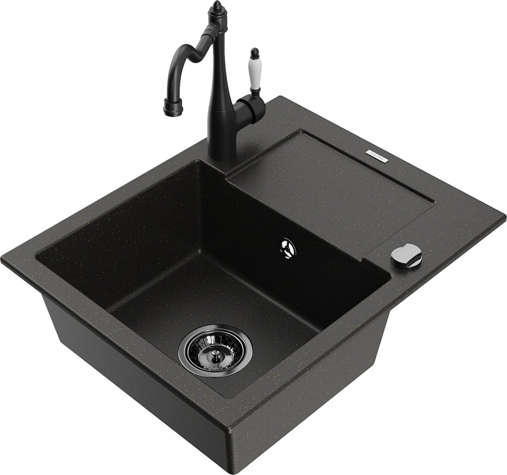 Technické dáta: drez: Rozmer: 576x465x174mm Hĺbka komory: 164 mm Rozmery komory: 395x320 mm Priemer odtoku: ø90 mm Typ: 1-miska s krátkym odkvapkávačom Typ: Zapustené do pracovnej dosky Farba: čierna / zlatá metalíza Povrchová úprava sifónu: čierna Materiál: žula (80% žulové kamenivo, 20% živice) Prepadový otvor: Áno Otvory: (batérie, automatické) 2 Inštalácia: Univerzálna, je možné inštalovať s odkvapkávačom na ľavú alebo pravú stranu Vysoká odolnosť proti poškriabaniu a zmene farby Odolnosť proti tepelným šokom Ľahko čistiteľný povrch Dva dodatočné vyfrézované otvory na samodierovanie ø35 kuchynská batéria: Materiál: mosadz Čierna farba Hlava: Keramická Prevzdušňovač: Áno Typ: Jedna páka Výška batérie: 290 mm Rozsah výtoku: 260 mm(GT) Ean: 5905315039187