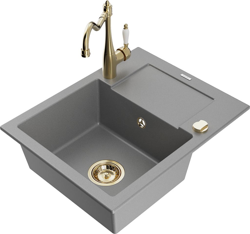 Technické dáta: drez: Rozmer: 576x465x174mm Hĺbka komory: 164 mm Rozmery komory: 395x320 mm Priemer odtoku: ø90 mm Typ: 1-miska s krátkym odkvapkávačom Typ: Zapustené do pracovnej dosky Šedá farba Povrchová úprava sifónu: zlatá Materiál: žula (80% žulové kamenivo, 20% živice) Prepadový otvor: Áno Otvory: (batérie, automatické) 2 Inštalácia: Univerzálna, je možné inštalovať s odkvapkávačom na ľavú alebo pravú stranu Vysoká odolnosť proti poškriabaniu a zmene farby Odolnosť proti tepelným šokom Ľahko čistiteľný povrch Dva dodatočné vyfrézované otvory na samodierovanie ø35 kuchynská batéria: Materiál: mosadz Farba: Zlatá Hlava: Keramická Prevzdušňovač: Áno Typ: Jedna páka Výška batérie: 290 mm Rozsah výtoku: 260 mm(GT) Ean: 5905315039071