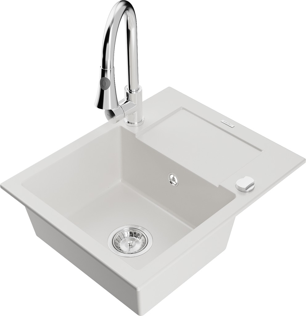 Technické dáta: drez: Rozmer: 576x465x174mm Hĺbka komory: 164 mm Rozmery komory: 395x320 mm Priemer odtoku: ø90 mm Typ: 1-miska s krátkym odkvapkávačom Typ: Zapustené do pracovnej dosky biela farba Povrchová úprava sifónu: Chrome Materiál: žula (80% žulové kamenivo, 20% živice) Prepadový otvor: Áno Otvory: (batérie, automatické) 2 Inštalácia: Univerzálna, je možné inštalovať s odkvapkávačom na ľavú alebo pravú stranu Vysoká odolnosť proti poškriabaniu a zmene farby Odolnosť proti tepelným šokom Ľahko čistiteľný povrch Dva dodatočné vyfrézované otvory na samodierovanie ø35 kuchynská batéria: Materiál: mosadz Farba: Chrome Hlava: Keramická Prevzdušňovač: Áno Typ: Jedna páka Výška batérie: 380 mm Rozsah výtoku: 252 mm Typ výtoku: Výsuvný(GT) Ean: 5905315028730