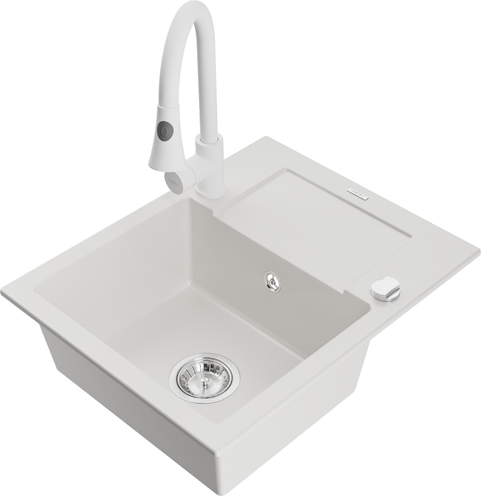 Technické dáta: drez: Rozmer: 576x465x174mm Hĺbka komory: 164 mm Rozmery komory: 395x320 mm Priemer odtoku: ø90 mm Typ: 1-miska s krátkym odkvapkávačom Typ: Zapustené do pracovnej dosky biela farba Povrchová úprava sifónu: Chrome Materiál: žula (80% žulové kamenivo, 20% živice) Prepadový otvor: Áno Otvory: (batérie, automatické) 2 Inštalácia: Univerzálna, je možné inštalovať s odkvapkávačom na ľavú alebo pravú stranu Vysoká odolnosť proti poškriabaniu a zmene farby Odolnosť proti tepelným šokom Ľahko čistiteľný povrch Dva dodatočné vyfrézované otvory na samodierovanie ø35 kuchynská batéria: Materiál: mosadz biela farba Hlava: Keramická Prevzdušňovač: Áno Typ: Jedna páka Výška batérie: 380 mm Rozsah výtoku: 252 mm Typ výtoku: Výsuvný(GT) Ean: 5905315028747