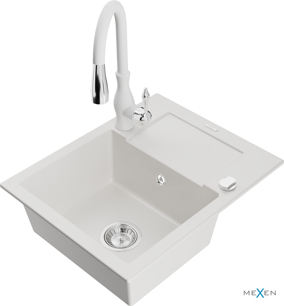 Technické dáta: drez: Rozmer: 576x465x174mm Hĺbka komory: 164 mm Rozmery komory: 395x320 mm Priemer odtoku: ø90 mm Typ: 1-miska s krátkym odkvapkávačom Typ: Zapustené do pracovnej dosky biela farba Povrchová úprava sifónu: Chrome Materiál: žula (80% žulové kamenivo, 20% živice) Prepadový otvor: Áno Otvory: (batérie, automatické) 2 Inštalácia: Univerzálna, je možné inštalovať s odkvapkávačom na ľavú alebo pravú stranu Vysoká odolnosť proti poškriabaniu a zmene farby Odolnosť proti tepelným šokom Ľahko čistiteľný povrch Dva dodatočné vyfrézované otvory na samodierovanie ø35 kuchynská batéria: Materiál: mosadz biela farba Hlava: Keramická Prevzdušňovač: Áno Typ: Jedna páka Výška batérie: 410 mm Rozsah výtoku: 231 mm(GT) Ean: 5905315033864