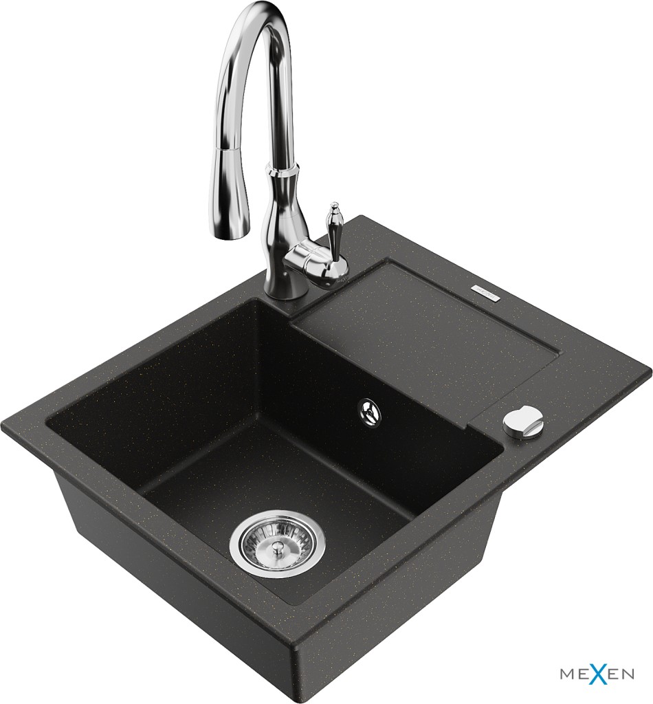 Technické dáta: drez: Rozmer: 576x465x174mm Hĺbka komory: 164 mm Rozmery komory: 395x320 mm Priemer odtoku: ø90 mm Typ: 1-miska s krátkym odkvapkávačom Typ: Zapustené do pracovnej dosky Farba: čierna / zlatá metalíza Povrchová úprava sifónu: Chrome Materiál: žula (80% žulové kamenivo, 20% živice) Prepadový otvor: Áno Otvory: (batérie, automatické) 2 Inštalácia: Univerzálna, je možné inštalovať s odkvapkávačom na ľavú alebo pravú stranu Vysoká odolnosť proti poškriabaniu a zmene farby Odolnosť proti tepelným šokom Ľahko čistiteľný povrch Dva dodatočné vyfrézované otvory na samodierovanie ø35 kuchynská batéria: Materiál: mosadz Farba: Chrome Hlava: Keramická Prevzdušňovač: Áno Typ: Jedna páka Výška batérie: 410 mm Rozsah výtoku: 231 mm(GT) Ean: 5905315034021