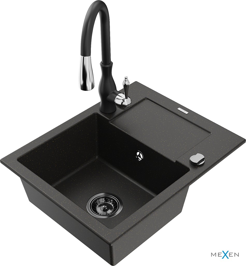 Technické dáta: drez: Rozmer: 576x465x174mm Hĺbka komory: 164 mm Rozmery komory: 395x320 mm Priemer odtoku: ø90 mm Typ: 1-miska s krátkym odkvapkávačom Typ: Zapustené do pracovnej dosky Farba: čierna / zlatá metalíza Povrchová úprava sifónu: čierna Materiál: žula (80% žulové kamenivo, 20% živice) Prepadový otvor: Áno Otvory: (batérie, automatické) 2 Inštalácia: Univerzálna, je možné inštalovať s odkvapkávačom na ľavú alebo pravú stranu Vysoká odolnosť proti poškriabaniu a zmene farby Odolnosť proti tepelným šokom Ľahko čistiteľný povrch Dva dodatočné vyfrézované otvory na samodierovanie ø35 kuchynská batéria: Materiál: mosadz Čierna farba Hlava: Keramická Prevzdušňovač: Áno Typ: Jedna páka Výška batérie: 410 mm Rozsah výtoku: 231 mm(GT) Ean: 5905315034052