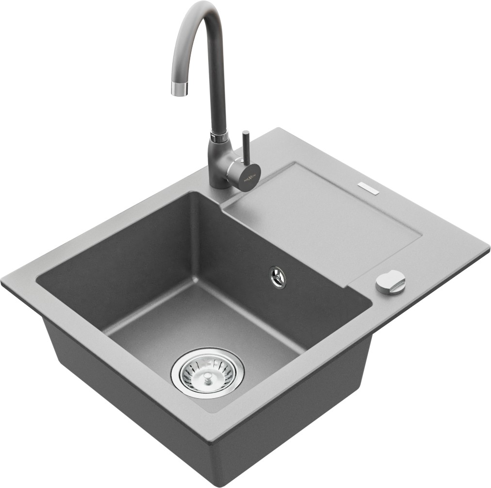 Technické dáta: drez: Rozmer: 576x465x174mm Hĺbka komory: 164 mm Rozmery komory: 395x320 mm Priemer odtoku: ø90 mm Typ: 1-miska s krátkym odkvapkávačom Typ: Zapustené do pracovnej dosky Šedá farba Povrchová úprava sifónu: Chrome Materiál: žula (80% žulové kamenivo, 20% živice) Prepadový otvor: Áno Otvory: (batérie, automatické) 2 Inštalácia: Univerzálna, je možné inštalovať s odkvapkávačom na ľavú alebo pravú stranu Vysoká odolnosť proti poškriabaniu a zmene farby Odolnosť proti tepelným šokom Ľahko čistiteľný povrch Dva dodatočné vyfrézované otvory na samodierovanie ø35 kuchynská batéria: Materiál: mosadz Šedá farba Hlava: Keramická Prevzdušňovač: Áno Výška batérie: 335 mm Rozsah výtoku: 180 mm(GT) Ean: 5907709189744