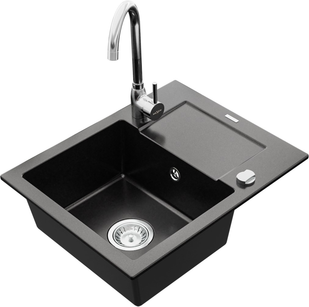 Technické dáta: drez: Rozmer: 576x465x174mm Hĺbka komory: 164 mm Rozmery komory: 395x320 mm Priemer odtoku: ø90 mm Typ: 1-miska s krátkym odkvapkávačom Typ: Zapustené do pracovnej dosky Čierna farba Povrchová úprava sifónu: Chrome Materiál: žula (80% žulové kamenivo, 20% živice) Prepadový otvor: Áno Otvory: (batérie, automatické) 2 Inštalácia: Univerzálna, je možné inštalovať s odkvapkávačom na ľavú alebo pravú stranu Vysoká odolnosť proti poškriabaniu a zmene farby Odolnosť proti tepelným šokom Ľahko čistiteľný povrch Dva dodatočné vyfrézované otvory na samodierovanie ø35 kuchynská batéria: Materiál: mosadz Farba: Chrome Hlava: Keramická Prevzdušňovač: Áno Výška batérie: 335 mm Rozsah výtoku: 180 mm(GT) Ean: 5907709189812