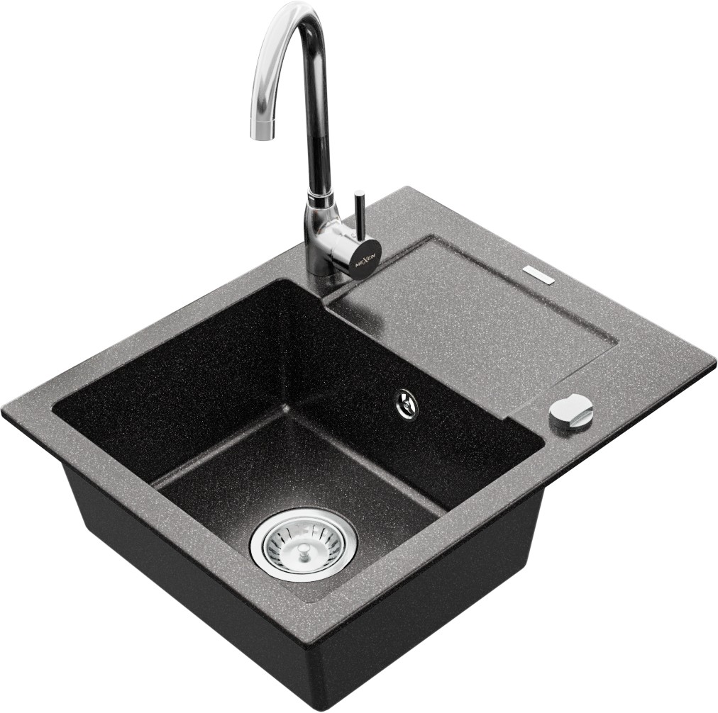 Technické dáta: drez: Rozmer: 576x465x174mm Hĺbka komory: 164 mm Rozmery komory: 395x320 mm Priemer odtoku: ø90 mm Typ: 1-miska s krátkym odkvapkávačom Typ: Zapustené do pracovnej dosky Farba: Škvrnitá čierna Materiál: žula (80% žulové kamenivo, 20% živice) Prepadový otvor: Áno Otvory: (batérie, automatické) 2 Inštalácia: Univerzálna, je možné inštalovať s odkvapkávačom na ľavú alebo pravú stranu Vysoká odolnosť proti poškriabaniu a zmene farby Odolnosť proti tepelným šokom Ľahko čistiteľný povrch Dva dodatočné vyfrézované otvory na samodierovanie ø35 kuchynská batéria: Materiál: mosadz Farba: Chrome Hlava: Keramická Prevzdušňovač: Áno Výška batérie: 335 mm Rozsah výtoku: 180 mm(GT) Ean: 5907709189799
