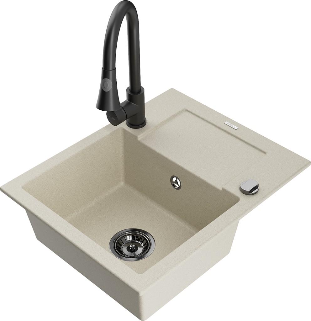 Technické dáta: drez: Rozmer: 576x465x174mm Hĺbka komory: 164 mm Rozmery komory: 395x320 mm Priemer odtoku: ø90 mm Typ: 1-miska s krátkym odkvapkávačom Typ: Zapustené do pracovnej dosky Farba béžová Povrchová úprava sifónu: čierna Materiál: žula (80% žulové kamenivo, 20% živice) Prepadový otvor: Áno Otvory: (batérie, automatické) 2 Inštalácia: Univerzálna, je možné inštalovať s odkvapkávačom na ľavú alebo pravú stranu Vysoká odolnosť proti poškriabaniu a zmene farby Odolnosť proti tepelným šokom Ľahko čistiteľný povrch Dva dodatočné vyfrézované otvory na samodierovanie ø35 kuchynská batéria: Materiál: mosadz Čierna farba Hlava: Keramická Prevzdušňovač: Áno Typ: Jedna páka Výška batérie: 380 mm Rozsah výtoku: 252 mm Typ výtoku: Výsuvný(GT) Ean: 5905315028808