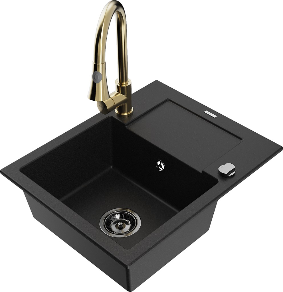 Technické dáta: drez: Rozmer: 576x465x174mm Hĺbka komory: 164 mm Rozmery komory: 395x320 mm Priemer odtoku: ø90 mm Typ: 1-miska s krátkym odkvapkávačom Typ: Zapustené do pracovnej dosky Čierna farba Povrchová úprava sifónu: čierna Materiál: žula (80% žulové kamenivo, 20% živice) Prepadový otvor: Áno Otvory: (batérie, automatické) 2 Inštalácia: Univerzálna, je možné inštalovať s odkvapkávačom na ľavú alebo pravú stranu Vysoká odolnosť proti poškriabaniu a zmene farby Odolnosť proti tepelným šokom Ľahko čistiteľný povrch Dva dodatočné vyfrézované otvory na samodierovanie ø35 kuchynská batéria: Materiál: mosadz Farba: Zlatá Hlava: Keramická Prevzdušňovač: Áno Typ: Jedna páka Výška batérie: 380 mm Rozsah výtoku: 252 mm Typ výtoku: Výsuvný(GT) Ean: 5905315029027