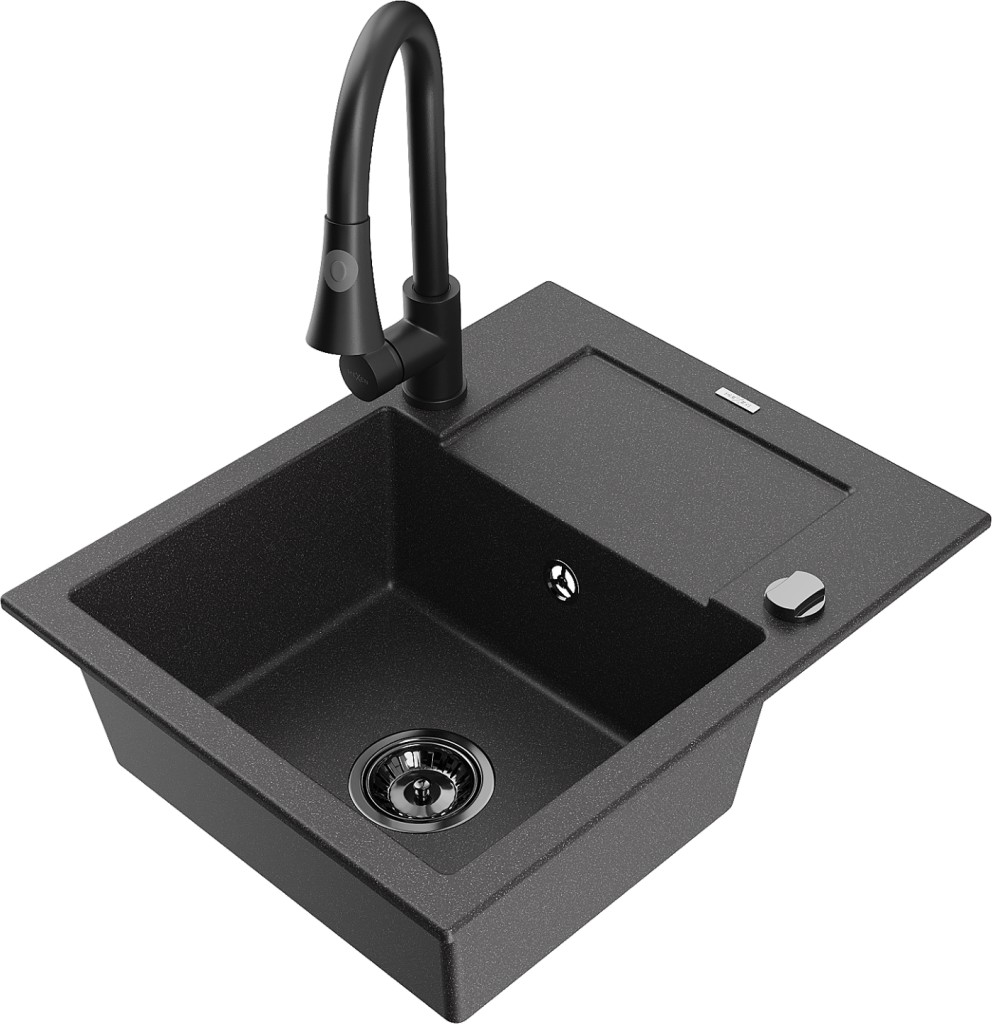 Technické dáta: drez: Rozmer: 576x465x174mm Hĺbka komory: 164 mm Rozmery komory: 395x320 mm Priemer odtoku: ø90 mm Typ: 1-miska s krátkym odkvapkávačom Typ: Zapustené do pracovnej dosky Farba: Škvrnitá čierna Povrchová úprava sifónu: čierna Materiál: žula (80% žulové kamenivo, 20% živice) Prepadový otvor: Áno Otvory: (batérie, automatické) 2 Inštalácia: Univerzálna, je možné inštalovať s odkvapkávačom na ľavú alebo pravú stranu Vysoká odolnosť proti poškriabaniu a zmene farby Odolnosť proti tepelným šokom Ľahko čistiteľný povrch Dva dodatočné vyfrézované otvory na samodierovanie ø35 kuchynská batéria: Materiál: mosadz Čierna farba Hlava: Keramická Prevzdušňovač: Áno Typ: Jedna páka Výška batérie: 380 mm Rozsah výtoku: 252 mm Typ výtoku: Výsuvný(GT) Ean: 5905315028983