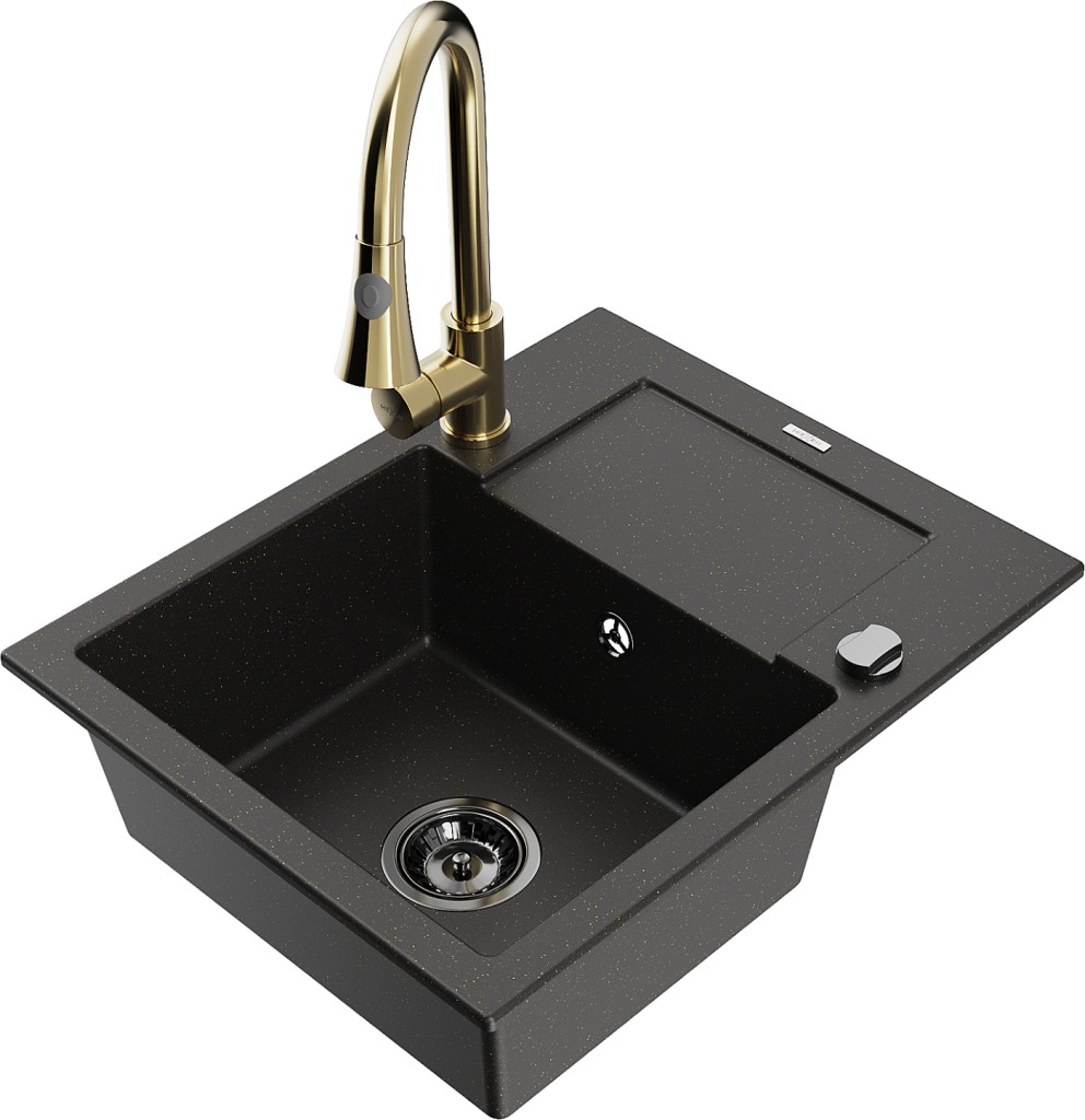 Technické dáta: drez: Rozmer: 576x465x174mm Hĺbka komory: 164 mm Rozmery komory: 395x320 mm Priemer odtoku: ø90 mm Typ: 1-miska s krátkym odkvapkávačom Typ: Zapustené do pracovnej dosky Farba: čierna / zlatá metalíza Povrchová úprava sifónu: čierna Materiál: žula (80% žulové kamenivo, 20% živice) Prepadový otvor: Áno Otvory: (batérie, automatické) 2 Inštalácia: Univerzálna, je možné inštalovať s odkvapkávačom na ľavú alebo pravú stranu Vysoká odolnosť proti poškriabaniu a zmene farby Odolnosť proti tepelným šokom Ľahko čistiteľný povrch Dva dodatočné vyfrézované otvory na samodierovanie ø35 kuchynská batéria: Materiál: mosadz Farba: Zlatá Hlava: Keramická Prevzdušňovač: Áno Typ: Jedna páka Výška batérie: 380 mm Rozsah výtoku: 252 mm Typ výtoku: Výsuvný(GT) Ean: 5905315028921