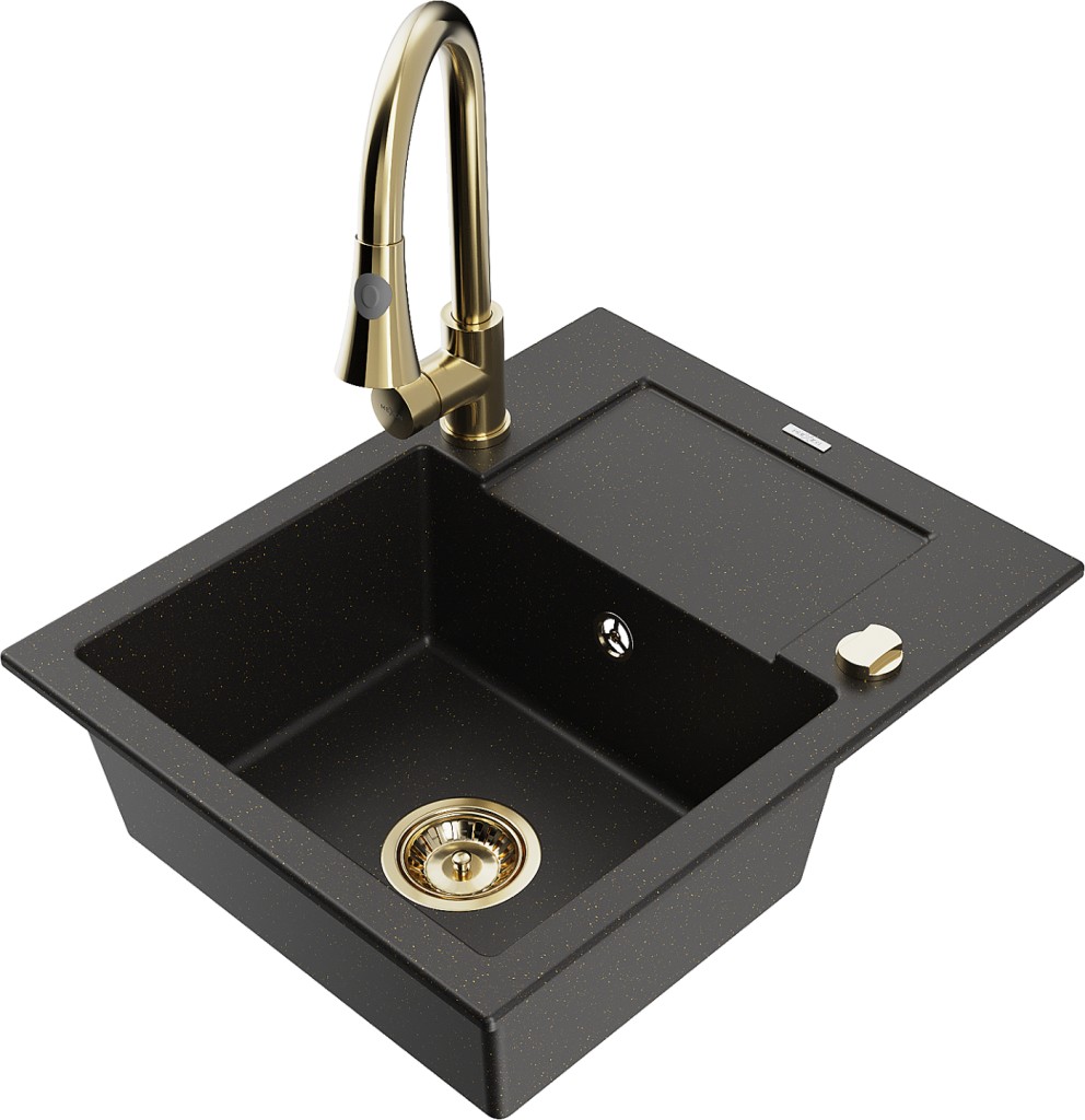 Technické dáta: drez: Rozmer: 576x465x174mm Hĺbka komory: 164 mm Rozmery komory: 395x320 mm Priemer odtoku: ø90 mm Typ: 1-miska s krátkym odkvapkávačom Typ: Zapustené do pracovnej dosky Farba: čierna / zlatá metalíza Povrchová úprava sifónu: zlatá Materiál: žula (80% žulové kamenivo, 20% živice) Prepadový otvor: Áno Otvory: (batérie, automatické) 2 Inštalácia: Univerzálna, je možné inštalovať s odkvapkávačom na ľavú alebo pravú stranu Vysoká odolnosť proti poškriabaniu a zmene farby Odolnosť proti tepelným šokom Ľahko čistiteľný povrch Dva dodatočné vyfrézované otvory na samodierovanie ø35 kuchynská batéria: Materiál: mosadz Farba: Zlatá Hlava: Keramická Prevzdušňovač: Áno Typ: Jedna páka Výška batérie: 380 mm Rozsah výtoku: 252 mm Typ výtoku: Výsuvný(GT) Ean: 5905315028914
