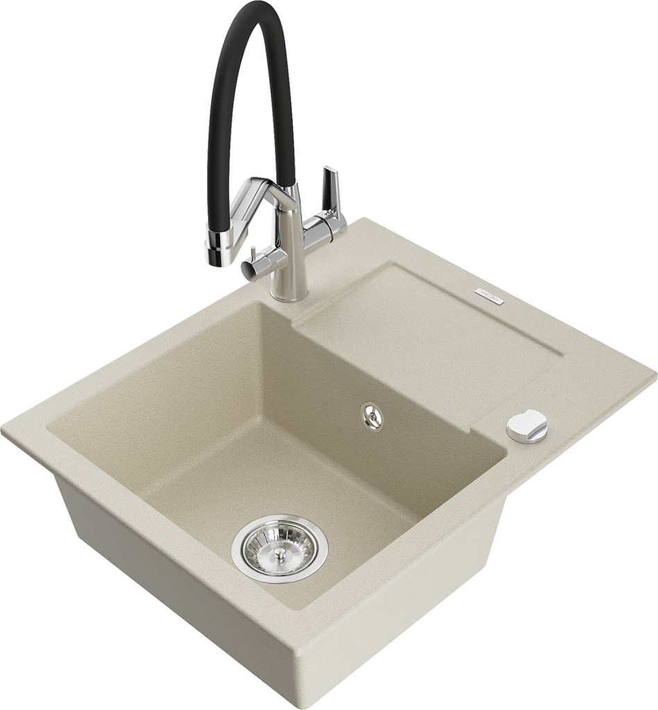 Technické dáta: drez: Rozmer: 576x465x174mm Hĺbka komory: 164 mm Rozmery komory: 395x320 mm Priemer odtoku: ø90 mm Typ: 1-miska s krátkym odkvapkávačom Typ: Zapustené do pracovnej dosky Farba béžová Povrchová úprava sifónu: Chrome Materiál: žula (80% žulové kamenivo, 20% živice) Prepadový otvor: Áno Otvory: (batérie, automatické) 2 Inštalácia: Univerzálna, je možné inštalovať s odkvapkávačom na ľavú alebo pravú stranu Vysoká odolnosť proti poškriabaniu a zmene farby Odolnosť proti tepelným šokom Ľahko čistiteľný povrch Dva dodatočné vyfrézované otvory na samodierovanie ø35 kuchynská batéria: Materiál: mosadz Farba: chróm/čierna Hlavy: Keramické Prevzdušňovač: Áno Typ hubica: Flexibilný s mosadzným držiakom Rozsah výtoku: 260 mm Výška: 405 mm Typ: Dve rukoväte Dvojhlavá batéria s prídavným filtrom na pitnú vodu(GT) Ean: 5905315100146