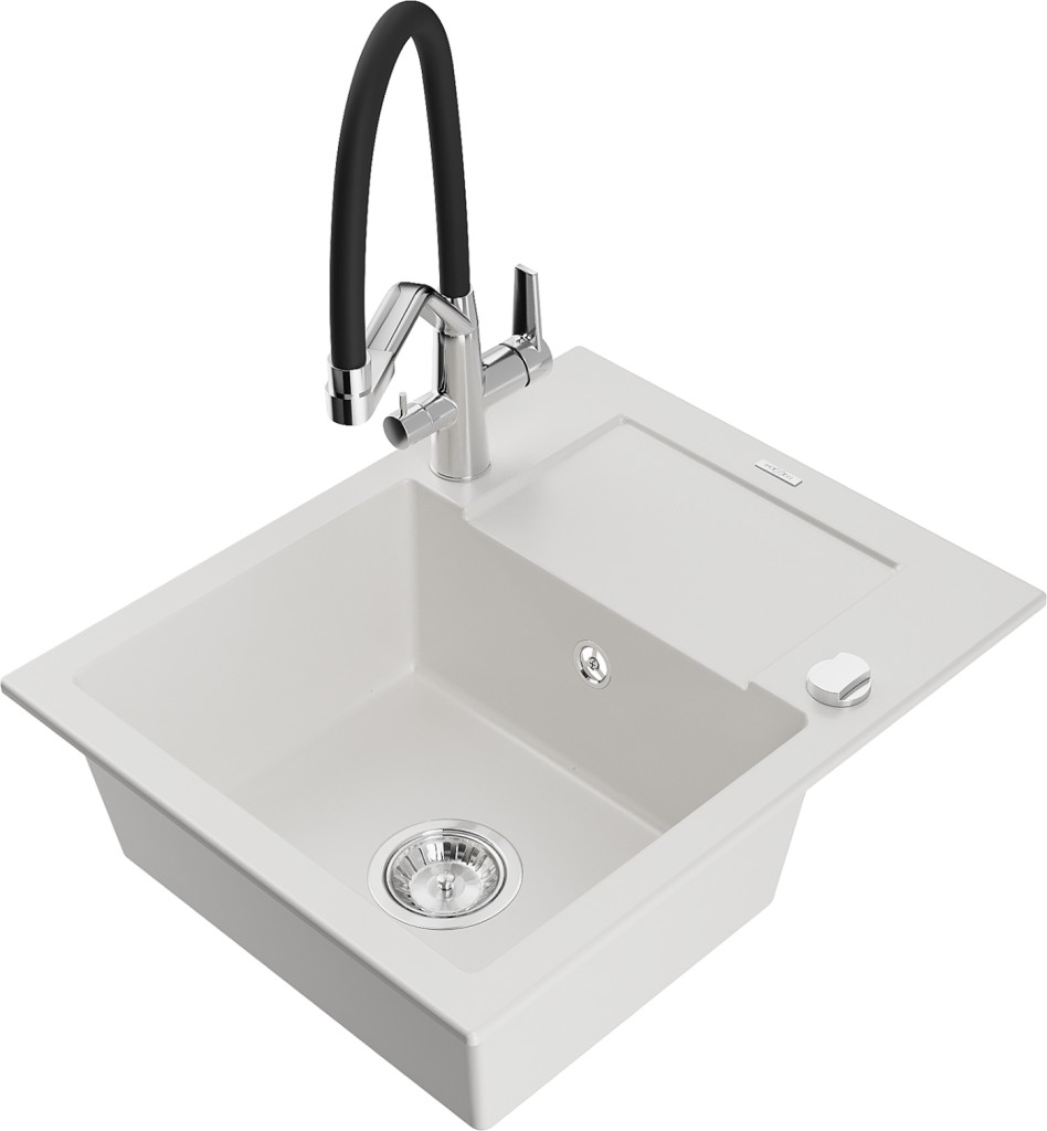 Technické dáta: drez: Rozmer: 576x465x174mm Hĺbka komory: 164 mm Rozmery komory: 395x320 mm Priemer odtoku: ø90 mm Typ: 1-miska s krátkym odkvapkávačom Typ: Zapustené do pracovnej dosky biela farba Povrchová úprava sifónu: Chrome Materiál: žula (80% žulové kamenivo, 20% živice) Prepadový otvor: Áno Otvory: (batérie, automatické) 2 Inštalácia: Univerzálna, je možné inštalovať s odkvapkávačom na ľavú alebo pravú stranu Vysoká odolnosť proti poškriabaniu a zmene farby Odolnosť proti tepelným šokom Ľahko čistiteľný povrch Dva dodatočné vyfrézované otvory na samodierovanie ø35 kuchynská batéria: Materiál: mosadz Farba: chróm/čierna Hlavy: Keramické Prevzdušňovač: Áno Typ hubica: Flexibilný s mosadzným držiakom Rozsah výtoku: 260 mm Výška: 405 mm Typ: Dve rukoväte Dvojhlavá batéria s prídavným filtrom na pitnú vodu(GT) Ean: 5905315100092