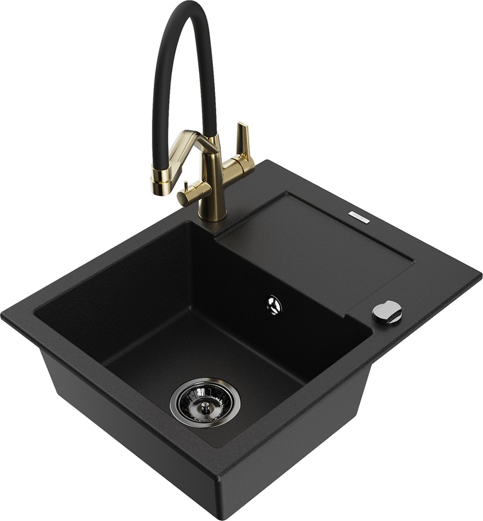 Technické dáta: drez: Rozmer: 576x465x174mm Hĺbka komory: 164 mm Rozmery komory: 395x320 mm Priemer odtoku: ø90 mm Typ: 1-miska s krátkym odkvapkávačom Typ: Zapustené do pracovnej dosky Čierna farba Povrchová úprava sifónu: čierna Materiál: žula (80% žulové kamenivo, 20% živice) Prepadový otvor: Áno Otvory: (batérie, automatické) 2 Inštalácia: Univerzálna, je možné inštalovať s odkvapkávačom na ľavú alebo pravú stranu Vysoká odolnosť proti poškriabaniu a zmene farby Odolnosť proti tepelným šokom Ľahko čistiteľný povrch Dva dodatočné vyfrézované otvory na samodierovanie ø35 kuchynská batéria: Materiál: mosadz Farba: Zlatá/Čierna Hlavy: Keramické Prevzdušňovač: Áno Typ hubica: Flexibilný s mosadzným držiakom Rozsah výtoku: 260 mm Výška: 405 mm Typ: Dve rukoväte Dvojhlavá batéria s prídavným filtrom na pitnú vodu(GT) Ean: 5905315100429