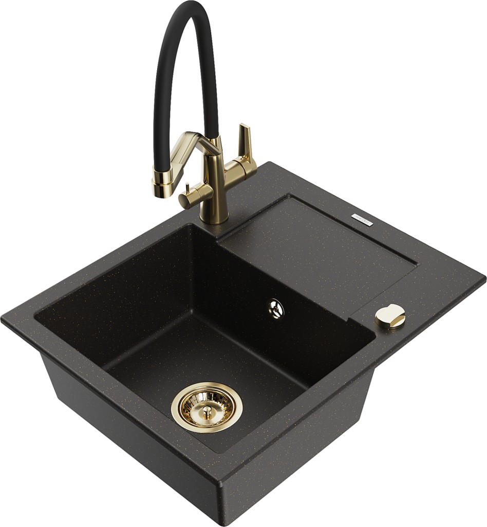Technické dáta: drez: Rozmer: 576x465x174mm Hĺbka komory: 164 mm Rozmery komory: 395x320 mm Priemer odtoku: ø90 mm Typ: 1-miska s krátkym odkvapkávačom Typ: Zapustené do pracovnej dosky Farba: čierna / zlatá metalíza Povrchová úprava sifónu: zlatá Materiál: žula (80% žulové kamenivo, 20% živice) Prepadový otvor: Áno Otvory: (batérie, automatické) 2 Inštalácia: Univerzálna, je možné inštalovať s odkvapkávačom na ľavú alebo pravú stranu Vysoká odolnosť proti poškriabaniu a zmene farby Odolnosť proti tepelným šokom Ľahko čistiteľný povrch Dva dodatočné vyfrézované otvory na samodierovanie ø35 kuchynská batéria: Materiál: mosadz Farba: Zlatá/Čierna Hlavy: Keramické Prevzdušňovač: Áno Typ hubica: Flexibilný s mosadzným držiakom Rozsah výtoku: 260 mm Výška: 405 mm Typ: Dve rukoväte Dvojhlavá batéria s prídavným filtrom na pitnú vodu(GT) Ean: 5905315100313