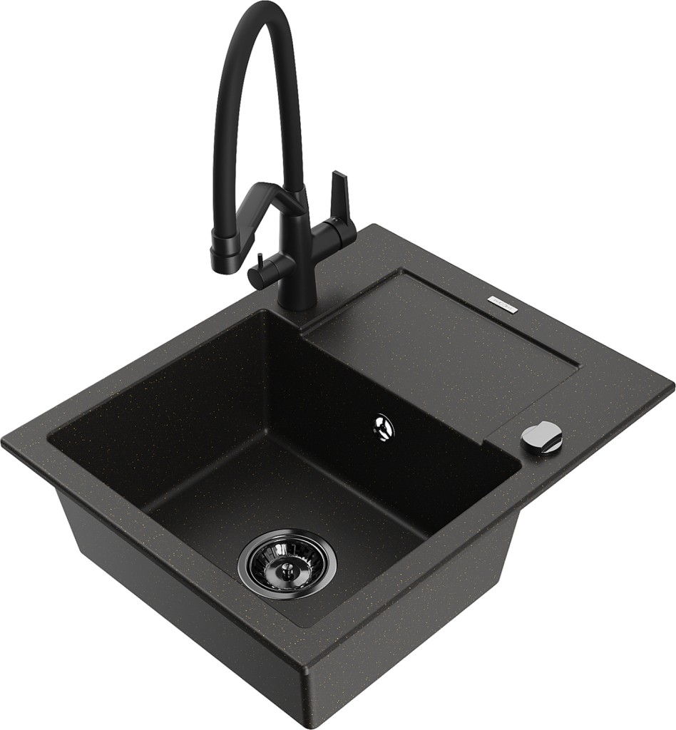 Technické dáta: drez: Rozmer: 576x465x174mm Hĺbka komory: 164 mm Rozmery komory: 395x320 mm Priemer odtoku: ø90 mm Typ: 1-miska s krátkym odkvapkávačom Typ: Zapustené do pracovnej dosky Farba: čierna / zlatá metalíza Povrchová úprava sifónu: čierna Materiál: žula (80% žulové kamenivo, 20% živice) Prepadový otvor: Áno Otvory: (batérie, automatické) 2 Inštalácia: Univerzálna, je možné inštalovať s odkvapkávačom na ľavú alebo pravú stranu Vysoká odolnosť proti poškriabaniu a zmene farby Odolnosť proti tepelným šokom Ľahko čistiteľný povrch Dva dodatočné vyfrézované otvory na samodierovanie ø35 kuchynská batéria: Materiál: mosadz Čierna farba Hlavy: Keramické Prevzdušňovač: Áno Typ hubica: Flexibilný s mosadzným držiakom Rozsah výtoku: 260 mm Výška: 405 mm Typ: Dve rukoväte Dvojhlavá batéria s prídavným filtrom na pitnú vodu(GT) Ean: 5905315100337