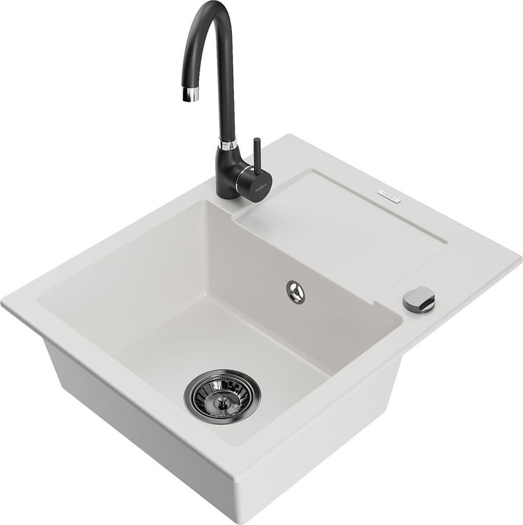 Technické dáta: drez: Rozmer: 576x465x174mm Hĺbka komory: 164 mm Rozmery komory: 395x320 mm Priemer odtoku: ø90 mm Typ: 1-miska s krátkym odkvapkávačom Typ: Zapustené do pracovnej dosky biela farba Povrchová úprava sifónu: čierna Materiál: žula (80% žulové kamenivo, 20% živice) Prepadový otvor: Áno Otvory: (batérie, automatické) 2 Inštalácia: Univerzálna, je možné inštalovať s odkvapkávačom na ľavú alebo pravú stranu Vysoká odolnosť proti poškriabaniu a zmene farby Odolnosť proti tepelným šokom Ľahko čistiteľný povrch Dva dodatočné vyfrézované otvory na samodierovanie ø35 kuchynská batéria: Materiál: mosadz Čierna farba Hlava: Keramická Prevzdušňovač: Áno Typ: Jedna páka Výška batérie: 335 mm Rozsah výtoku: 180 mm(GT) Ean: 5905315014573