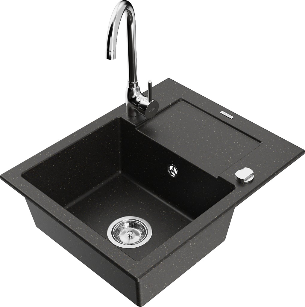 Technické dáta: drez: Rozmer: 576x465x174mm Hĺbka komory: 164 mm Rozmery komory: 395x320 mm Priemer odtoku: ø90 mm Typ: 1-miska s krátkym odkvapkávačom Typ: Zapustené do pracovnej dosky Farba: čierna / zlatá metalíza Povrchová úprava sifónu: Chrome Materiál: žula (80% žulové kamenivo, 20% živice) Prepadový otvor: Áno Otvory: (batérie, automatické) 2 Inštalácia: Univerzálna, je možné inštalovať s odkvapkávačom na ľavú alebo pravú stranu Vysoká odolnosť proti poškriabaniu a zmene farby Odolnosť proti tepelným šokom Ľahko čistiteľný povrch Dva dodatočné vyfrézované otvory na samodierovanie ø35 kuchynská batéria: Materiál: mosadz Farba: Chrome Hlava: Keramická Prevzdušňovač: Áno Typ: Jedna páka Výška batérie: 335 mm Rozsah výtoku: 180 mm(GT) Ean: 5905315014665
