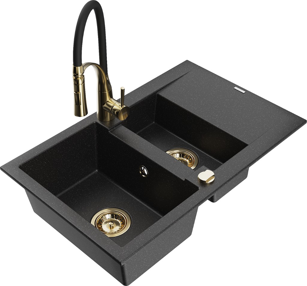 Technické dáta: drez: Rozmer: 737x475x177mm Hĺbka komory: 167 mm (väčšia), 107 mm (menšia) Rozmery komory: 395x272 mm (väčšie), (menšie) 375x182 mm Priemer odtoku: ø90 mm Typ: 1,5-komorový s krátkym odkvapkávačom Typ: Zapustené do pracovnej dosky Farba: čierna/strieborná metalíza Povrchová úprava sifónu: zlatá Materiál: žula (80% žulové kamenivo, 20% živice) Prepadový otvor: Áno Otvory: (batérie, automatické) 2 Inštalácia: Univerzálna, je možné inštalovať s odkvapkávačom na ľavú alebo pravú stranu Vysoká odolnosť proti poškriabaniu a zmene farby Odolnosť proti tepelným šokom Ľahko čistiteľný povrch kuchynská batéria: Materiál: mosadz Farba: Zlatá/Čierna Hlava: Keramická Prevzdušňovač: Áno Typ: Jedna páka Výška batérie: 430 mm Rozsah výtoku: 185 mm Batéria má výsuvný výtok(GT) Ean: 5905315045249