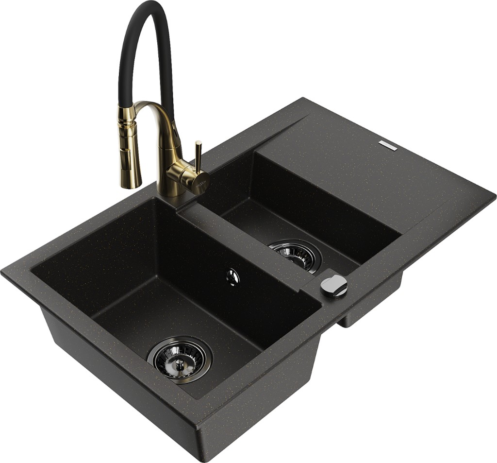 Technické dáta: drez: Rozmer: 737x475x177mm Hĺbka komory: 167 mm (väčšia), 107 mm (menšia) Rozmery komory: 395x272 mm (väčšie), (menšie) 375x182 mm Priemer odtoku: ø90 mm Typ: 1,5-komorový s krátkym odkvapkávačom Typ: Zapustené do pracovnej dosky Farba: čierna / zlatá metalíza Povrchová úprava sifónu: čierna Materiál: žula (80% žulové kamenivo, 20% živice) Prepadový otvor: Áno Otvory: (batérie, automatické) 2 Inštalácia: Univerzálna, je možné inštalovať s odkvapkávačom na ľavú alebo pravú stranu Vysoká odolnosť proti poškriabaniu a zmene farby Odolnosť proti tepelným šokom Ľahko čistiteľný povrch kuchynská batéria: Materiál: mosadz Farba: Zlatá/Čierna Hlava: Keramická Prevzdušňovač: Áno Typ: Jedna páka Výška batérie: 430 mm Rozsah výtoku: 185 mm Batéria má výsuvný výtok(GT) Ean: 5905315045317
