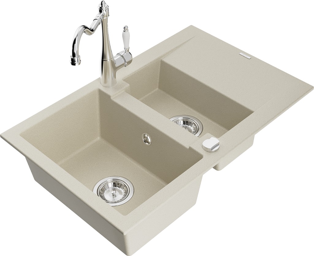 Technické dáta: Drez: Rozmer: 737x475x177 mm Hĺbka komory: 167 mm (väčšia), 107 mm (menšia) Rozmery komory: 395x272 mm (väčšie), (menšie) 375x182 mm Priemer odtoku: ø90 mm Typ: 1,5-miska s krátkym odkvapkávačom Typ: Zapustené do pracovnej dosky Farba béžová Povrchová úprava sifónu: Chrome Materiál: žula (80% žulové kamenivo 20% živice) Prepadový otvor: Áno Otvory: (batérie, automat) 2 Inštalácia: Univerzálna, je možné inštalovať s odkvapkávačom na ľavú alebo pravú stranu Vysoká odolnosť proti poškriabaniu a zmene farby Odolnosť proti tepelným šokom Povrch pre ľahké čistenie Kuchynská batéria: Materiál: mosadz Farba: Chrome Hlava: Keramická Perlátor: Áno Typ: Jednopákové Výška batérie: 290 mm Rozsah výtoku: 260 mm(GT) Ean: 5905315039347