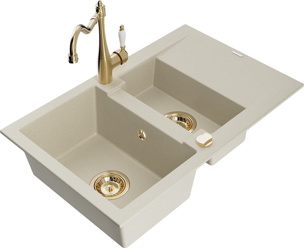 Technické dáta: Drez: Rozmer: 737x475x177 mm Hĺbka komory: 167 mm (väčšia), 107 mm (menšia) Rozmery komory: 395x272 mm (väčšie), (menšie) 375x182 mm Priemer odtoku: ø90 mm Typ: 1,5-miska s krátkym odkvapkávačom Typ: Zapustené do pracovnej dosky Farba béžová Povrchová úprava sifónu: zlatá Materiál: žula (80% žulové kamenivo 20% živice) Prepadový otvor: Áno Otvory: (batérie, automat) 2 Inštalácia: Univerzálna, je možné inštalovať s odkvapkávačom na ľavú alebo pravú stranu Vysoká odolnosť proti poškriabaniu a zmene farby Odolnosť proti tepelným šokom Povrch pre ľahké čistenie Kuchynská batéria: Materiál: mosadz Farba: Zlatá Hlava: Keramická Perlátor: Áno Typ: Jednopákové Výška batérie: 290 mm Rozsah výtoku: 260 mm(GT) Ean: 5905315039361