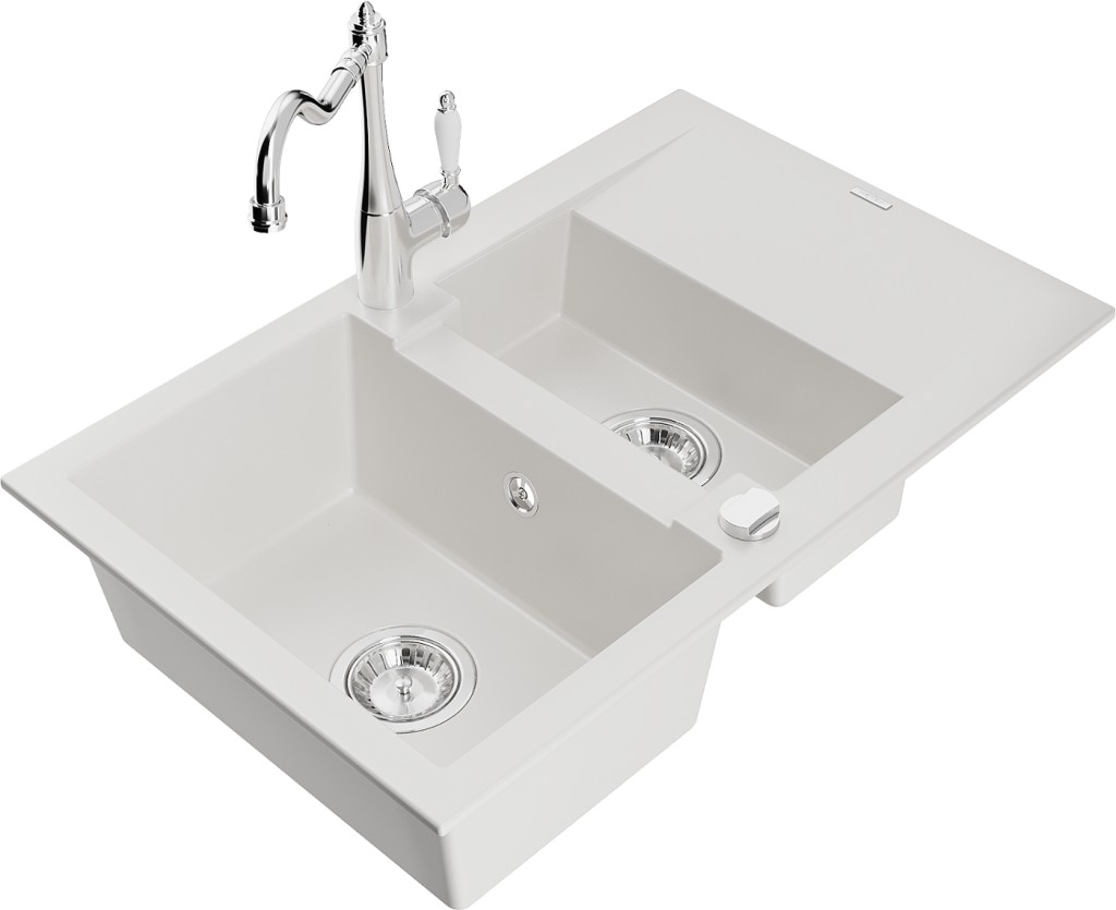 Technické dáta: drez: Rozmer: 737x475x177mm Hĺbka komory: 167 mm (väčšia), 107 mm (menšia) Rozmery komory: 395x272 mm (väčšie), (menšie) 375x182 mm Priemer odtoku: ø90 mm Typ: 1,5-komorový s krátkym odkvapkávačom Typ: Zapustené do pracovnej dosky biela farba Povrchová úprava sifónu: Chrome Materiál: žula (80% žulové kamenivo, 20% živice) Prepadový otvor: Áno Otvory: (batérie, automatické) 2 Inštalácia: Univerzálna, je možné inštalovať s odkvapkávačom na ľavú alebo pravú stranu Vysoká odolnosť proti poškriabaniu a zmene farby Odolnosť proti tepelným šokom Ľahko čistiteľný povrch kuchynská batéria: Materiál: mosadz Farba: Chrome Hlava: Keramická Prevzdušňovač: Áno Typ: Jedna páka Výška batérie: 290 mm Rozsah výtoku: 260 mm(GT) Ean: 5905315039309