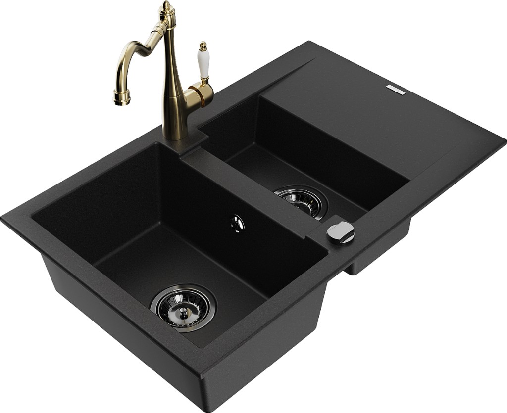 Technické dáta: drez: Rozmer: 737x475x177mm Hĺbka komory: 167 mm (väčšia), 107 mm (menšia) Rozmery komory: 395x272 mm (väčšie), (menšie) 375x182 mm Priemer odtoku: ø90 mm Typ: 1,5-komorový s krátkym odkvapkávačom Typ: Zapustené do pracovnej dosky Čierna farba Povrchová úprava sifónu: čierna Materiál: žula (80% žulové kamenivo, 20% živice) Prepadový otvor: Áno Otvory: (batérie, automatické) 2 Inštalácia: Univerzálna, je možné inštalovať s odkvapkávačom na ľavú alebo pravú stranu Vysoká odolnosť proti poškriabaniu a zmene farby Odolnosť proti tepelným šokom Ľahko čistiteľný povrch kuchynská batéria: Materiál: mosadz Farba: Zlatá Hlava: Keramická Prevzdušňovač: Áno Typ: Jedna páka Výška batérie: 290 mm Rozsah výtoku: 260 mm(GT) Ean: 5905315039590