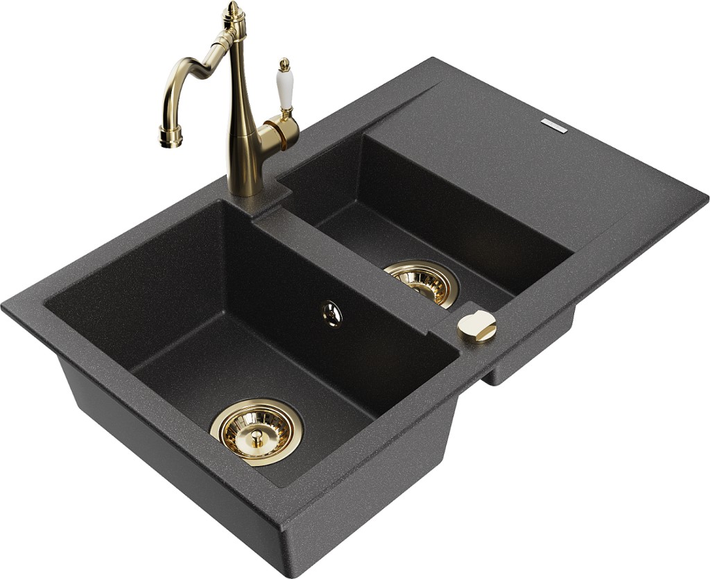 Technické dáta: drez: Rozmer: 737x475x177mm Hĺbka komory: 167 mm (väčšia), 107 mm (menšia) Rozmery komory: 395x272 mm (väčšie), (menšie) 375x182 mm Priemer odtoku: ø90 mm Typ: 1,5-miska s krátkym odkvapkávačom Typ: Zapustené do pracovnej dosky Farba: Škvrnitá čierna Povrchová úprava sifónu: zlatá Materiál: žula (80% žulové kamenivo, 20% živice) Prepadový otvor: Áno Otvory: (batérie, automatické) 2 Inštalácia: Univerzálna, je možné inštalovať s odkvapkávačom na ľavú alebo pravú stranu Vysoká odolnosť proti poškriabaniu a zmene farby Odolnosť proti tepelným šokom Ľahko čistiteľný povrch kuchynská batéria: Materiál: mosadz Farba: Zlatá Hlava: Keramická Prevzdušňovač: Áno Typ: Jedna páka Výška batérie: 290 mm Rozsah výtoku: 260 mm(GT) Ean: 5905315039538