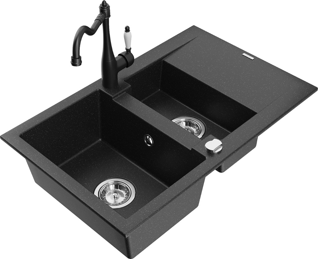 Technické dáta: drez: Rozmer: 737x475x177mm Hĺbka komory: 167 mm (väčšia), 107 mm (menšia) Rozmery komory: 395x272 mm (väčšie), (menšie) 375x182 mm Priemer odtoku: ø90 mm Typ: 1,5-miska s krátkym odkvapkávačom Typ: Zapustené do pracovnej dosky Farba: čierna/strieborná metalíza Povrchová úprava sifónu: Chrome Materiál: žula (80% žulové kamenivo, 20% živice) Prepadový otvor: Áno Otvory: (batérie, automatické) 2 Inštalácia: Univerzálna, je možné inštalovať s odkvapkávačom na ľavú alebo pravú stranu Vysoká odolnosť proti poškriabaniu a zmene farby Odolnosť proti tepelným šokom Ľahko čistiteľný povrch kuchynská batéria: Materiál: mosadz Čierna farba Hlava: Keramická Prevzdušňovač: Áno Typ: Jedna páka Výška batérie: 290 mm Rozsah výtoku: 260 mm(GT) Ean: 5905315039453