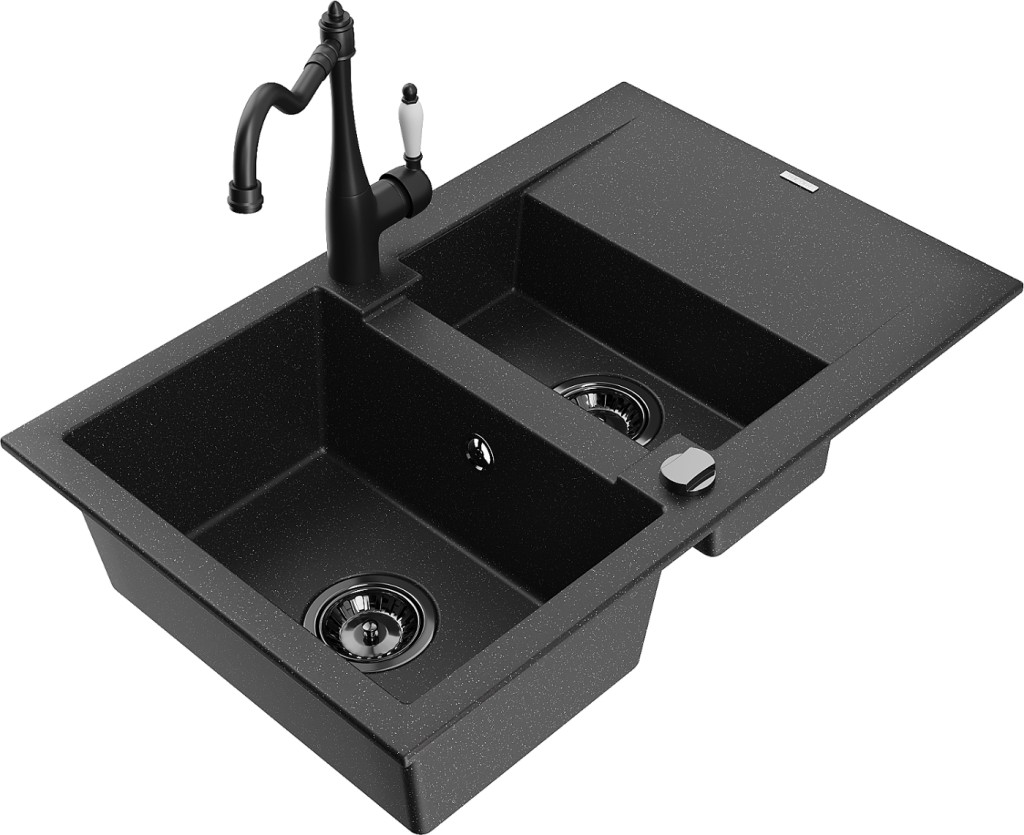 Technické dáta: drez: Rozmer: 737x475x177mm Hĺbka komory: 167 mm (väčšia), 107 mm (menšia) Rozmery komory: 395x272 mm (väčšie), (menšie) 375x182 mm Priemer odtoku: ø90 mm Typ: 1,5-komorový s krátkym odkvapkávačom Typ: Zapustené do pracovnej dosky Farba: čierna/strieborná metalíza Povrchová úprava sifónu: čierna Materiál: žula (80% žulové kamenivo, 20% živice) Prepadový otvor: Áno Otvory: (batérie, automatické) 2 Inštalácia: Univerzálna, je možné inštalovať s odkvapkávačom na ľavú alebo pravú stranu Vysoká odolnosť proti poškriabaniu a zmene farby Odolnosť proti tepelným šokom Ľahko čistiteľný povrch kuchynská batéria: Materiál: mosadz Čierna farba Hlava: Keramická Prevzdušňovač: Áno Typ: Jedna páka Výška batérie: 290 mm Rozsah výtoku: 260 mm(GT) Ean: 5905315039460