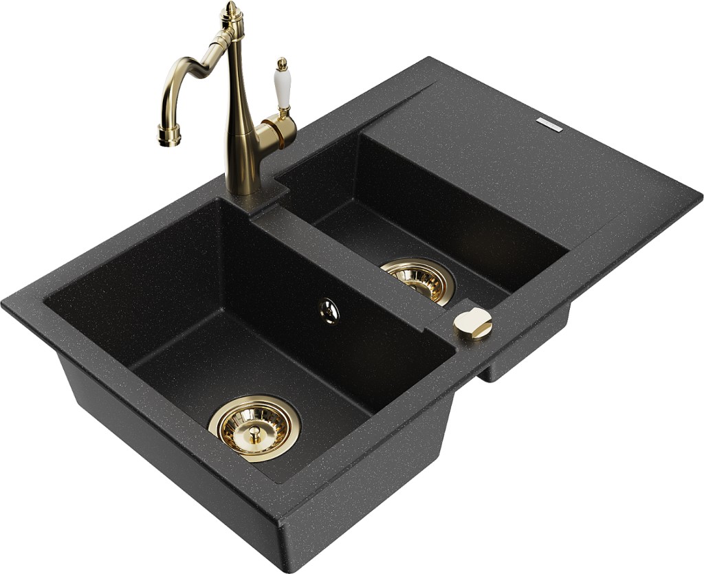 Technické dáta: drez: Rozmer: 737x475x177mm Hĺbka komory: 167 mm (väčšia), 107 mm (menšia) Rozmery komory: 395x272 mm (väčšie), (menšie) 375x182 mm Priemer odtoku: ø90 mm Typ: 1,5-komorový s krátkym odkvapkávačom Typ: Zapustené do pracovnej dosky Farba: čierna/strieborná metalíza Povrchová úprava sifónu: zlatá Materiál: žula (80% žulové kamenivo, 20% živice) Prepadový otvor: Áno Otvory: (batérie, automatické) 2 Inštalácia: Univerzálna, je možné inštalovať s odkvapkávačom na ľavú alebo pravú stranu Vysoká odolnosť proti poškriabaniu a zmene farby Odolnosť proti tepelným šokom Ľahko čistiteľný povrch kuchynská batéria: Materiál: mosadz Farba: Zlatá Hlava: Keramická Prevzdušňovač: Áno Typ: Jedna páka Výška batérie: 290 mm Rozsah výtoku: 260 mm(GT) Ean: 5905315039446