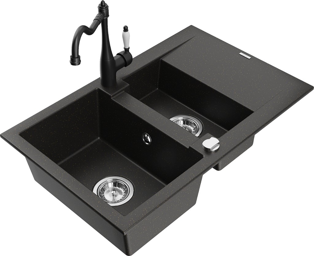 Technické dáta: drez: Rozmer: 737x475x177mm Hĺbka komory: 167 mm (väčšia), 107 mm (menšia) Rozmery komory: 395x272 mm (väčšie), (menšie) 375x182 mm Priemer odtoku: ø90 mm Typ: 1,5-komorový s krátkym odkvapkávačom Typ: Zapustené do pracovnej dosky Farba: čierna / zlatá metalíza Povrchová úprava sifónu: Chrome Materiál: žula (80% žulové kamenivo, 20% živice) Prepadový otvor: Áno Otvory: (batérie, automatické) 2 Inštalácia: Univerzálna, je možné inštalovať s odkvapkávačom na ľavú alebo pravú stranu Vysoká odolnosť proti poškriabaniu a zmene farby Odolnosť proti tepelným šokom Ľahko čistiteľný povrch kuchynská batéria: Materiál: mosadz Čierna farba Hlava: Keramická Prevzdušňovač: Áno Typ: Jedna páka Výška batérie: 290 mm Rozsah výtoku: 260 mm(GT) Ean: 5905315039507