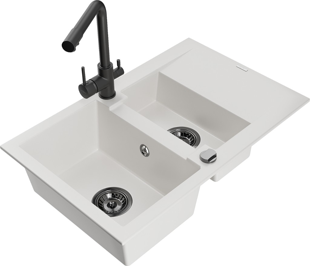 Technické dáta: drez: Rozmer: 737x475x177mm Hĺbka komory: 167 mm (väčšia), 107 mm (menšia) Rozmery komory: 395x272 mm (väčšie), (menšie) 375x182 mm Priemer odtoku: ø90 mm Typ: 1,5-komorový s krátkym odkvapkávačom Typ: Zapustené do pracovnej dosky biela farba Povrchová úprava sifónu: čierna Materiál: žula (80% žulové kamenivo, 20% živice) Prepadový otvor: Áno Otvory: (batérie, automatické) 2 Inštalácia: Univerzálna, je možné inštalovať s odkvapkávačom na ľavú alebo pravú stranu Vysoká odolnosť proti poškriabaniu a zmene farby Odolnosť proti tepelným šokom Ľahko čistiteľný povrch kuchynská batéria: Materiál: mosadz Čierna farba Hlava: Keramická Prevzdušňovač: Áno Typ: Dve rukoväte Rozsah výtoku: 235 mm Výška batérie: 315 mm Dvojhlavá batéria s prídavným kanálom pre filtrovanú pitnú vodu(GT) Ean: 5905315023964