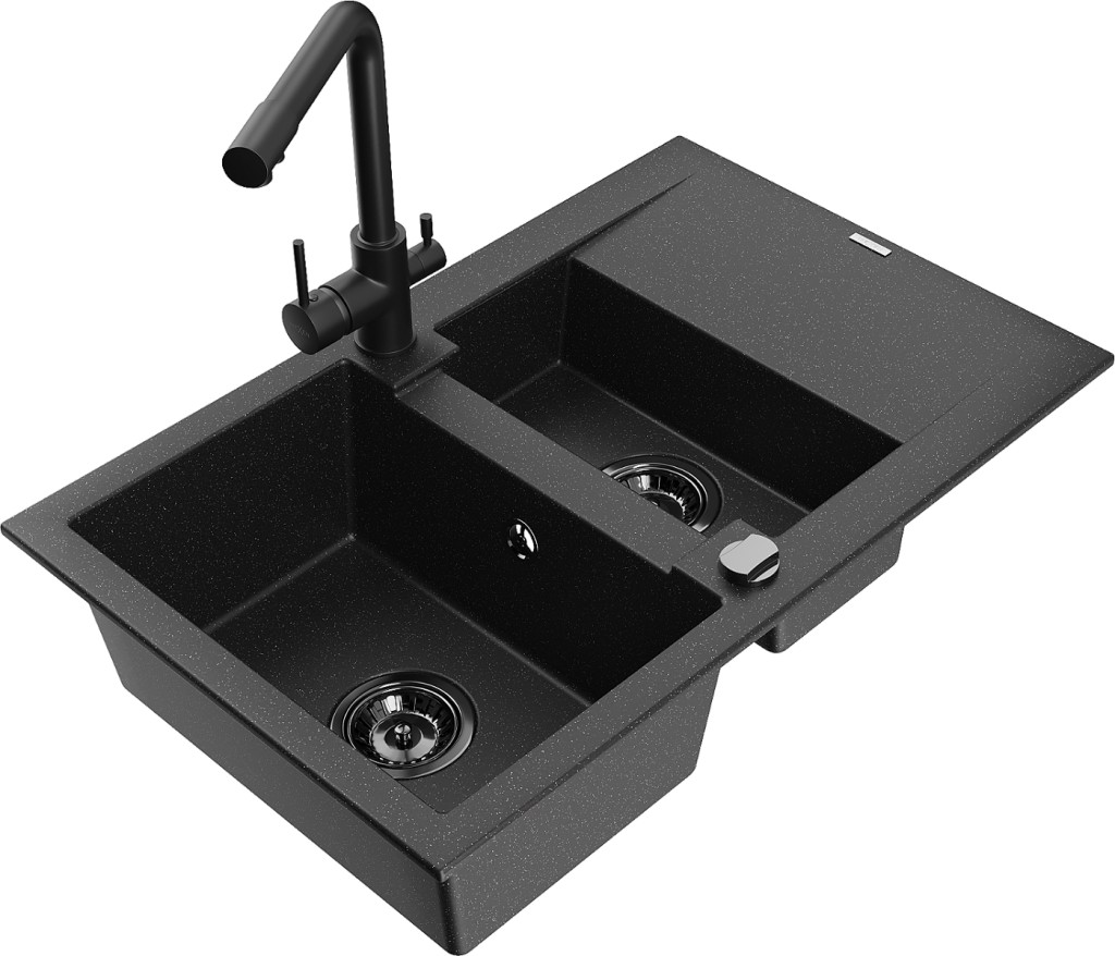 Technické dáta: drez: Rozmer: 737x475x177mm Hĺbka komory: 167 mm (väčšia), 107 mm (menšia) Rozmery komory: 395x272 mm (väčšie), (menšie) 375x182 mm Priemer odtoku: ø90 mm Typ: 1,5-komorový s krátkym odkvapkávačom Typ: Zapustené do pracovnej dosky Farba: čierna/strieborná metalíza Povrchová úprava sifónu: čierna Materiál: žula (80% žulové kamenivo, 20% živice) Prepadový otvor: Áno Otvory: (batérie, automatické) 2 Inštalácia: Univerzálna, je možné inštalovať s odkvapkávačom na ľavú alebo pravú stranu Vysoká odolnosť proti poškriabaniu a zmene farby Odolnosť proti tepelným šokom Ľahko čistiteľný povrch kuchynská batéria: Materiál: mosadz Čierna farba Hlava: Keramická Prevzdušňovač: Áno Typ: Dve rukoväte Rozsah výtoku: 235 mm Výška batérie: 315 mm Dvojhlavá batéria s prídavným kanálom pre filtrovanú pitnú vodu(GT) Ean: 5905315024091